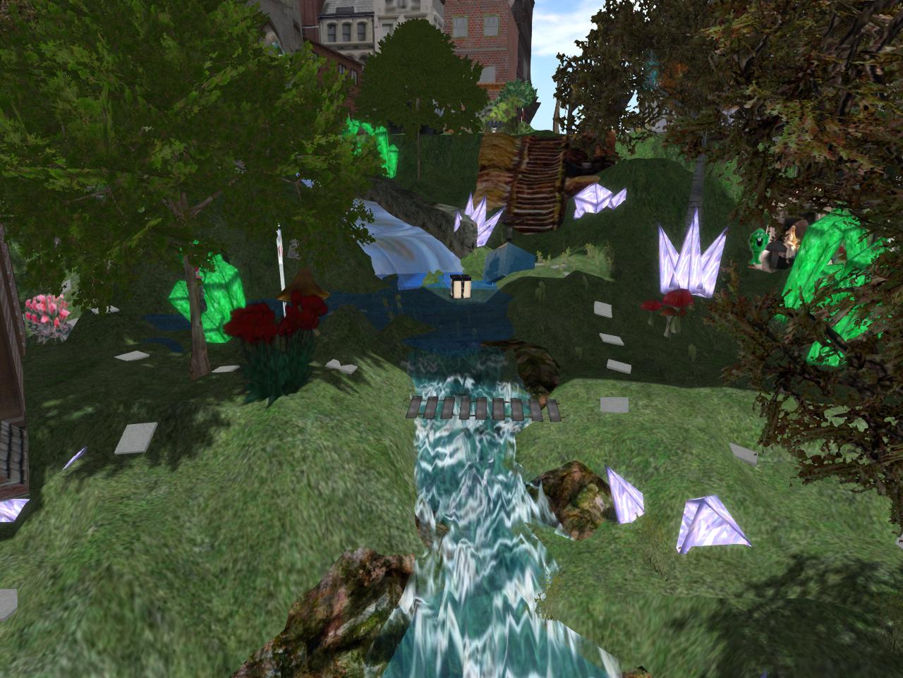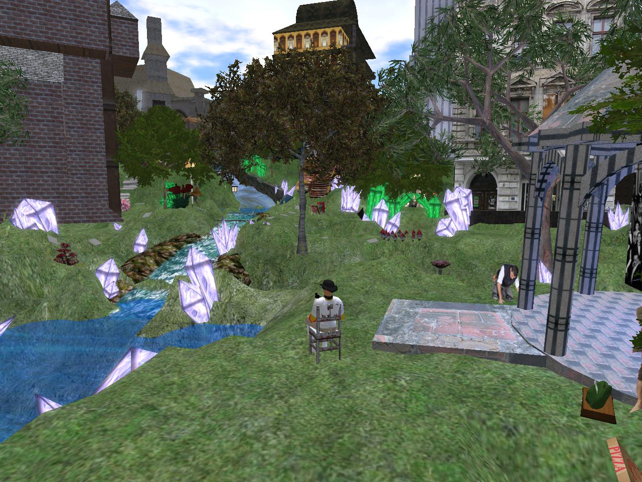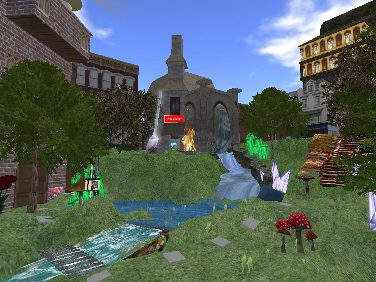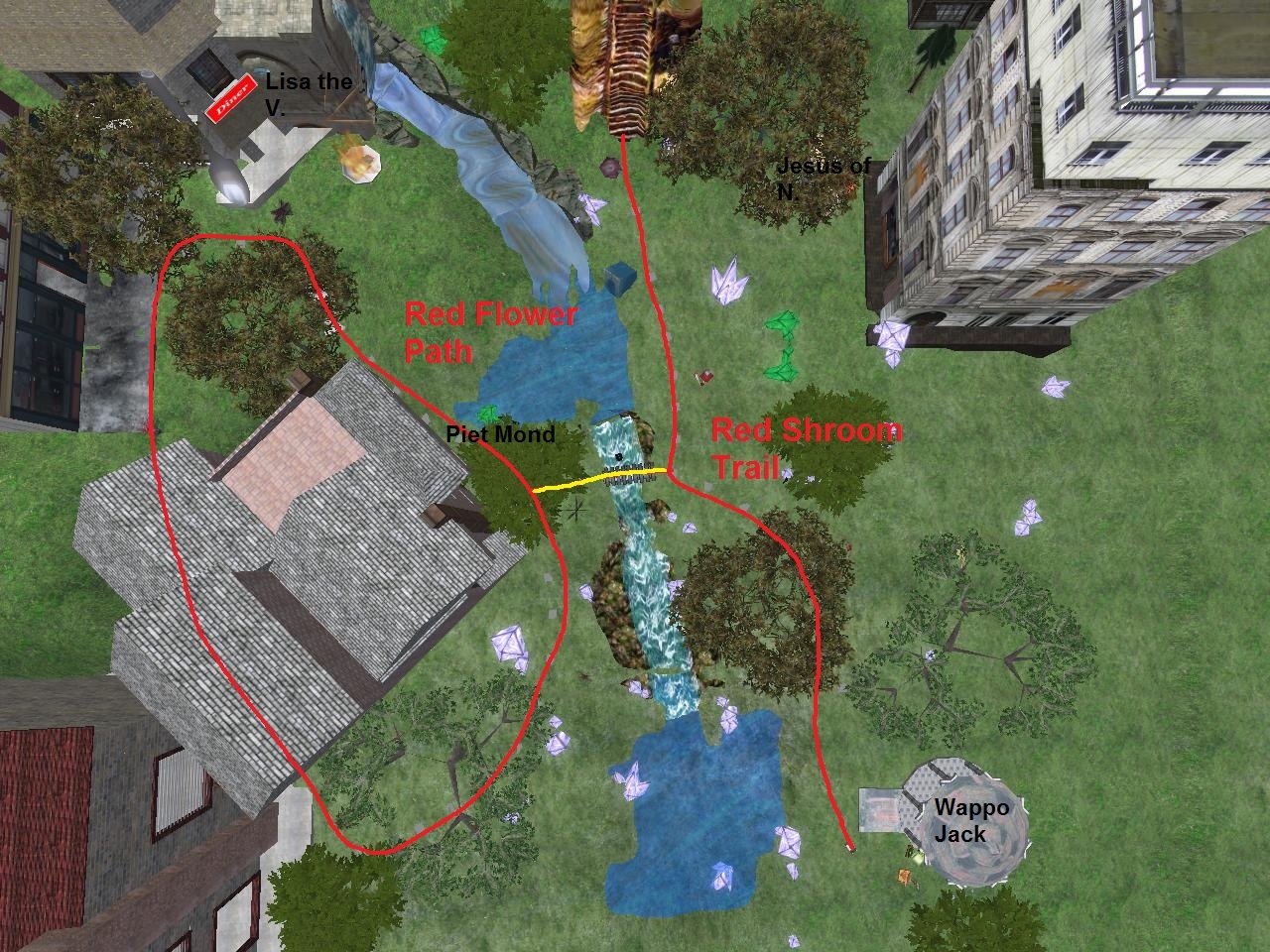 Anyway, there are now two defined cobblestone walkways in the Crystal Fields section of Collagesity. The Path of the Red Flower lies to the north (left) of its middle or central stream, and the Red Shroom Trail lies to the south (right). A short middle section centered by a bridge over Central Stream connects the two. The displays formerly found in the Mysten version of the TILE Temple (still standing as of 1:40 AM Tuesday, July 8th, but slated to be derezzed at any time) have now all exteriorized into this landscape in one form or another. The most confusing of these is the status of Lisa The Vegetarian, who seems to be the most important of the 4 winners from the latest deity contest. While Wappo Jack, Piet Mond, and Jesus of Nazareth have all translated more or less intact from temple to landscape, Lisa the Vegetarian might have been replaced by or yielded to fellow deity Carrcassonnee inside the town diner. What the reasoning for this is I can’t guess without Hucka D.’s help. But he appears to be less and less involved with this blog. Perhaps we can get answers from Carrcassonnee herself. I’ll have Baker Bloch put in an appearance at her new shrine.