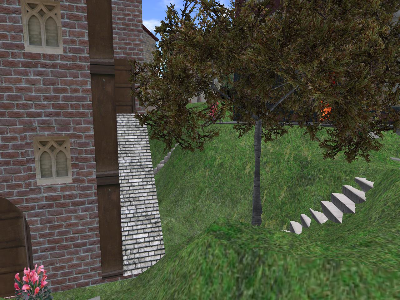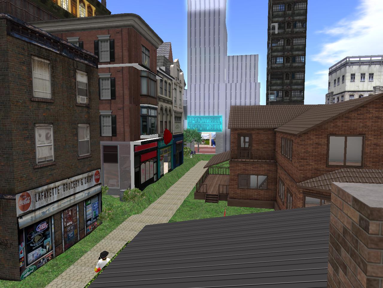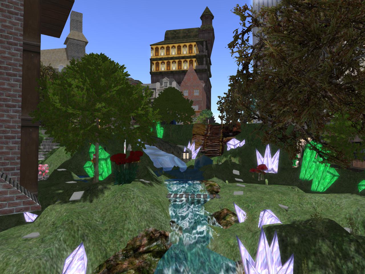 Anyway, there are now two defined cobblestone walkways in the Crystal Fields section of Collagesity. The Path of the Red Flower lies to the north (left) of its middle or central stream, and the Red Shroom Trail lies to the south (right). A short middle section centered by a bridge over Central Stream connects the two. The displays formerly found in the Mysten version of the TILE Temple (still standing as of 1:40 AM Tuesday, July 8th, but slated to be derezzed at any time) have now all exteriorized into this landscape in one form or another. The most confusing of these is the status of Lisa The Vegetarian, who seems to be the most important of the 4 winners from the latest deity contest. While Wappo Jack, Piet Mond, and Jesus of Nazareth have all translated more or less intact from temple to landscape, Lisa the Vegetarian might have been replaced by or yielded to fellow deity Carrcassonnee inside the town diner. What the reasoning for this is I can’t guess without Hucka D.’s help. But he appears to be less and less involved with this blog. Perhaps we can get answers from Carrcassonnee herself. I’ll have Baker Bloch put in an appearance at her new shrine.