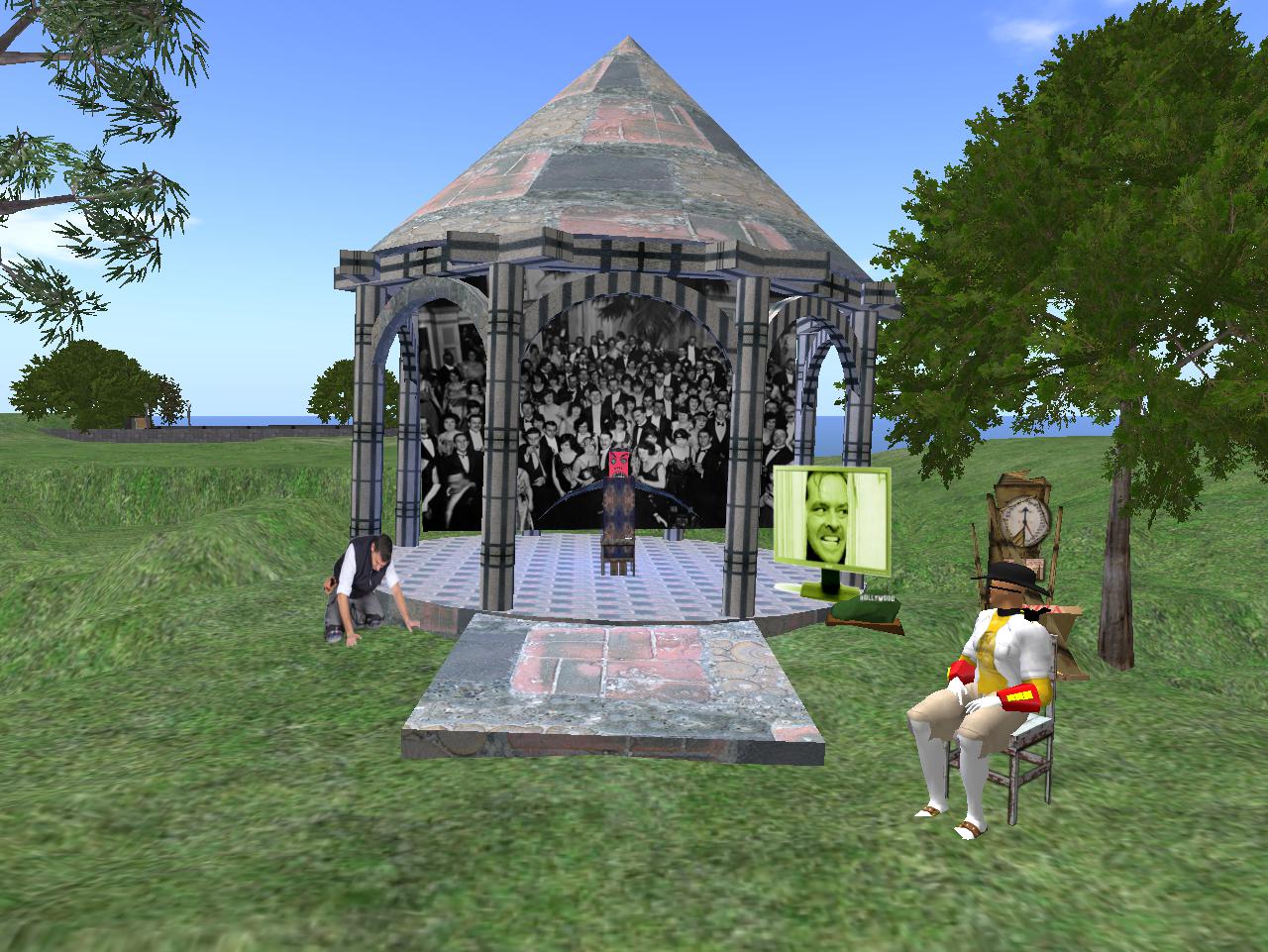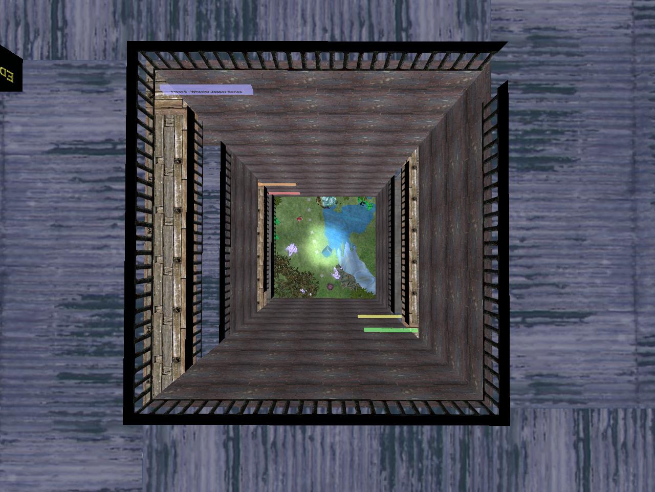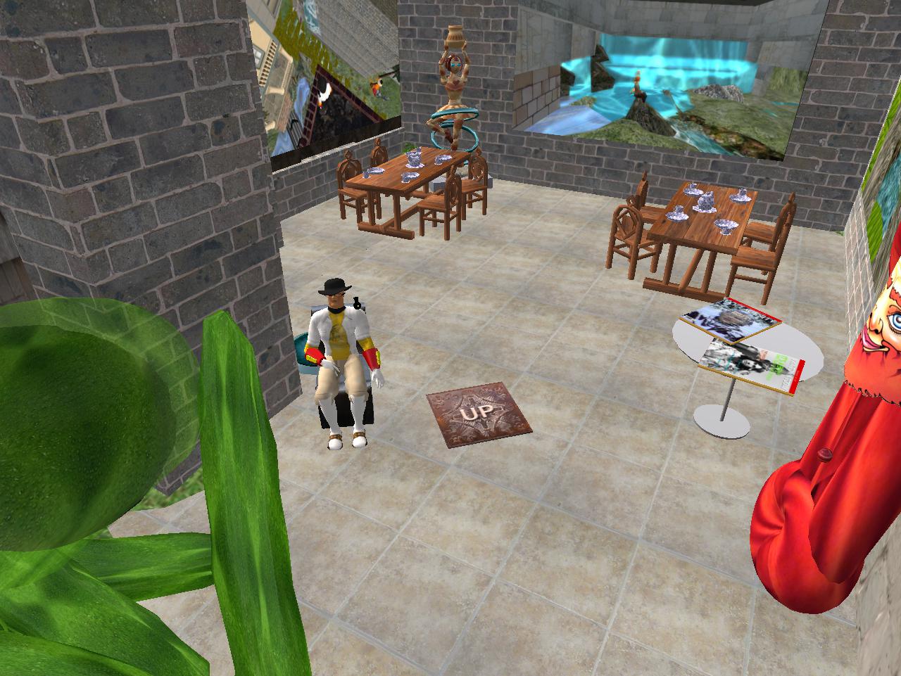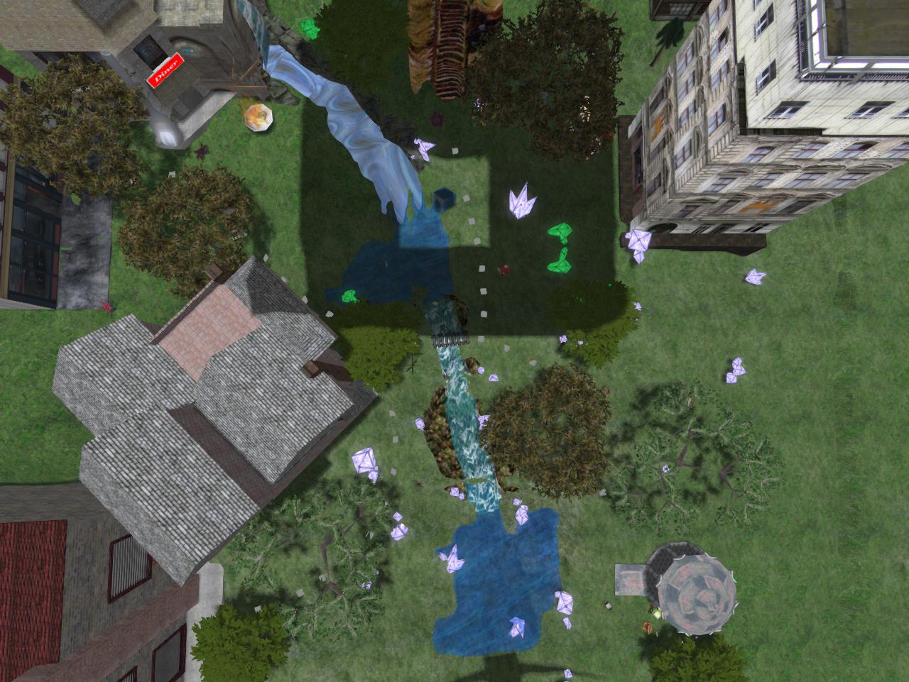 Anyway, there are now two defined cobblestone walkways in the Crystal Fields section of Collagesity. The Path of the Red Flower lies to the north (left) of its middle or central stream, and the Red Shroom Trail lies to the south (right). A short middle section centered by a bridge over Central Stream connects the two. The displays formerly found in the Mysten version of the TILE Temple (still standing as of 1:40 AM Tuesday, July 8th, but slated to be derezzed at any time) have now all exteriorized into this landscape in one form or another. The most confusing of these is the status of Lisa The Vegetarian, who seems to be the most important of the 4 winners from the latest deity contest. While Wappo Jack, Piet Mond, and Jesus of Nazareth have all translated more or less intact from temple to landscape, Lisa the Vegetarian might have been replaced by or yielded to fellow deity Carrcassonnee inside the town diner. What the reasoning for this is I can’t guess without Hucka D.’s help. But he appears to be less and less involved with this blog. Perhaps we can get answers from Carrcassonnee herself. I’ll have Baker Bloch put in an appearance at her new shrine.