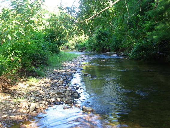 Moving beyond this wider swath of land between stream and civilization, we quickly encounter a series of apt. buildings, the first of which can be quite clearly seen from the creek. People within the apts. can also see me, and one did while tossing refuge in a pile at the top of the creek bank near me as I waded by. He seemed appropriately puzzled about what I was doing. But then he moved on, perhaps thinking I was fishing for trout, although I had no rod in hand. Or perhaps he just didn’t care and had more important things to consider at the time, like what to cook for supper.