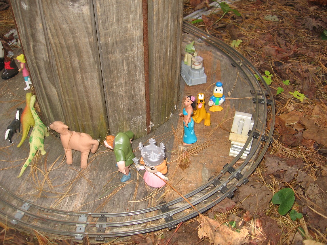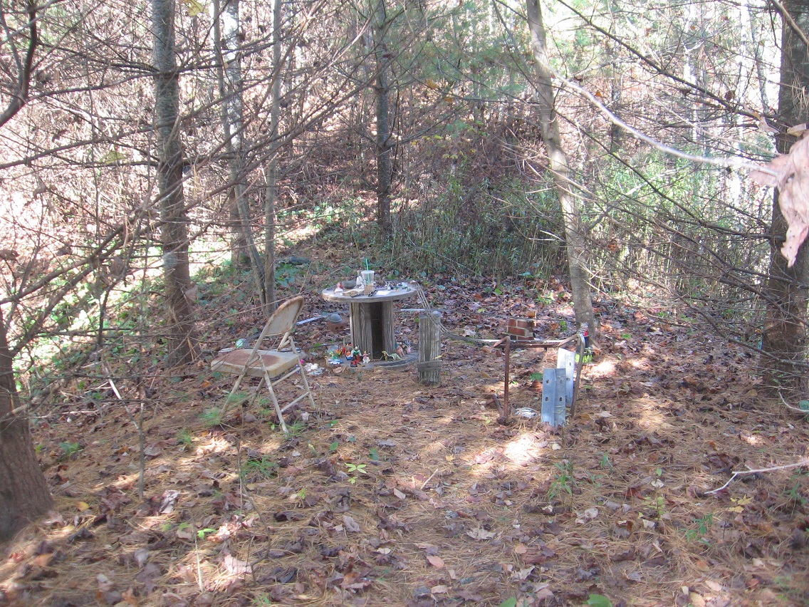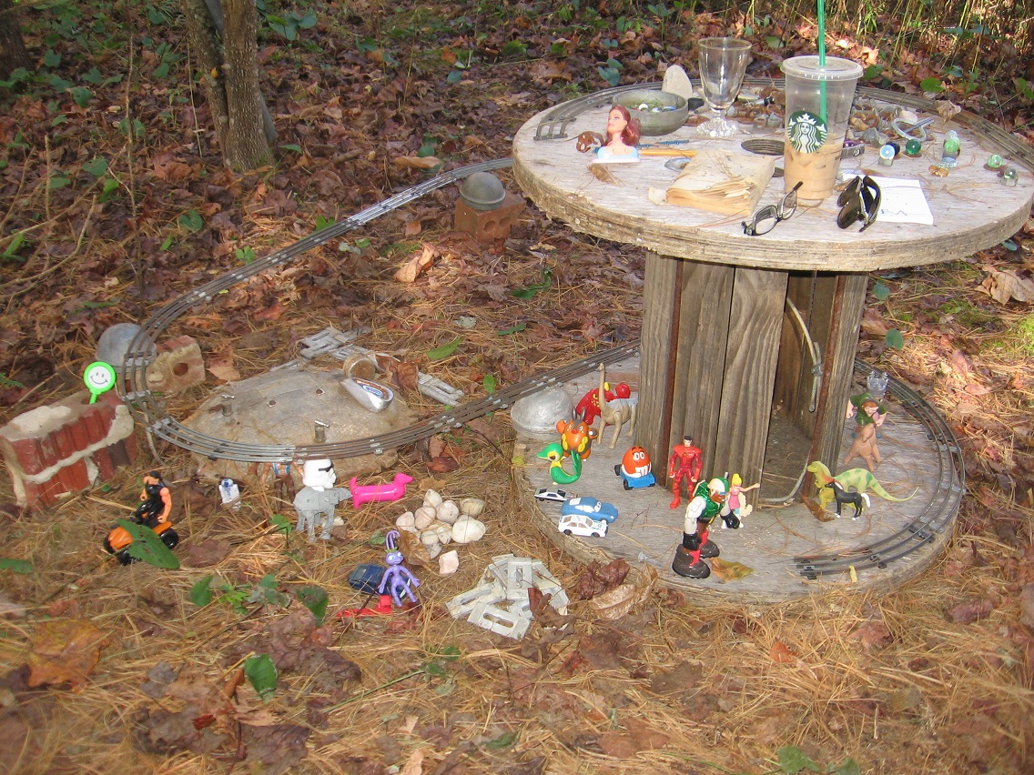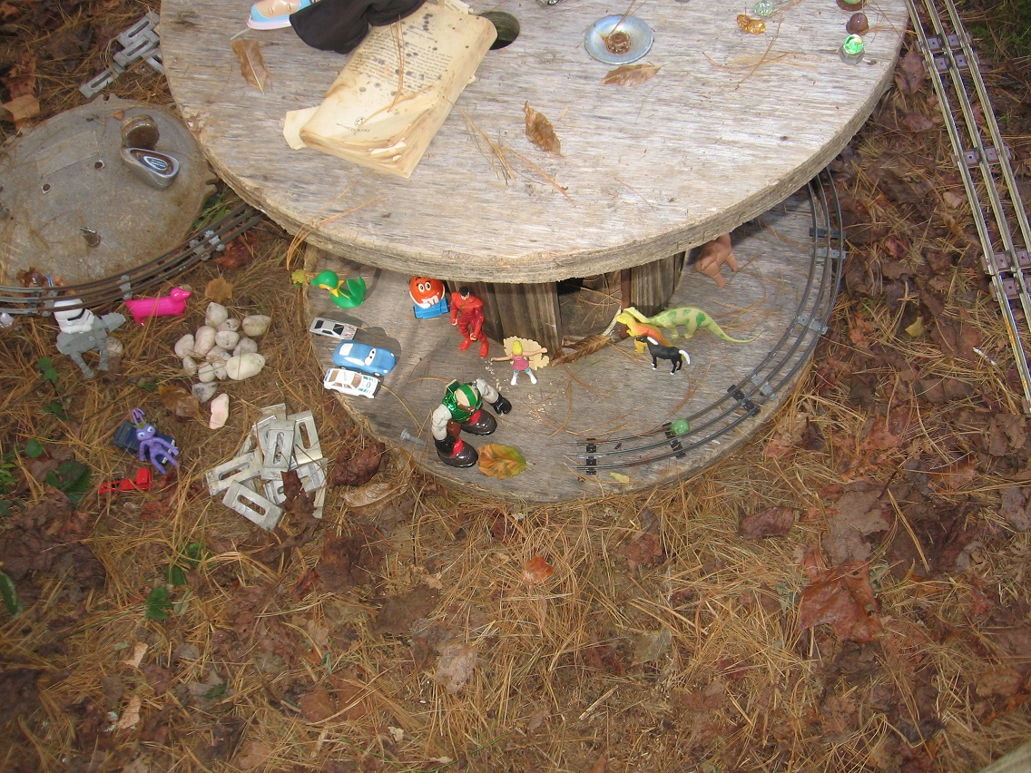 While Taum Sauk was busy on his exploring trip, I dismantled the marble race track and also packed away all the Bigfoot toy avatars into my satchel, leaving only Taum’s friend Empty Promises behind. He plans to live in the center of the Spool Table, a winter caretaker for Bigfoot as it were. And I’m sure Taum will be by to visit on occasion when he can burrow out of the snow and make a return trip to the now abandoned town.