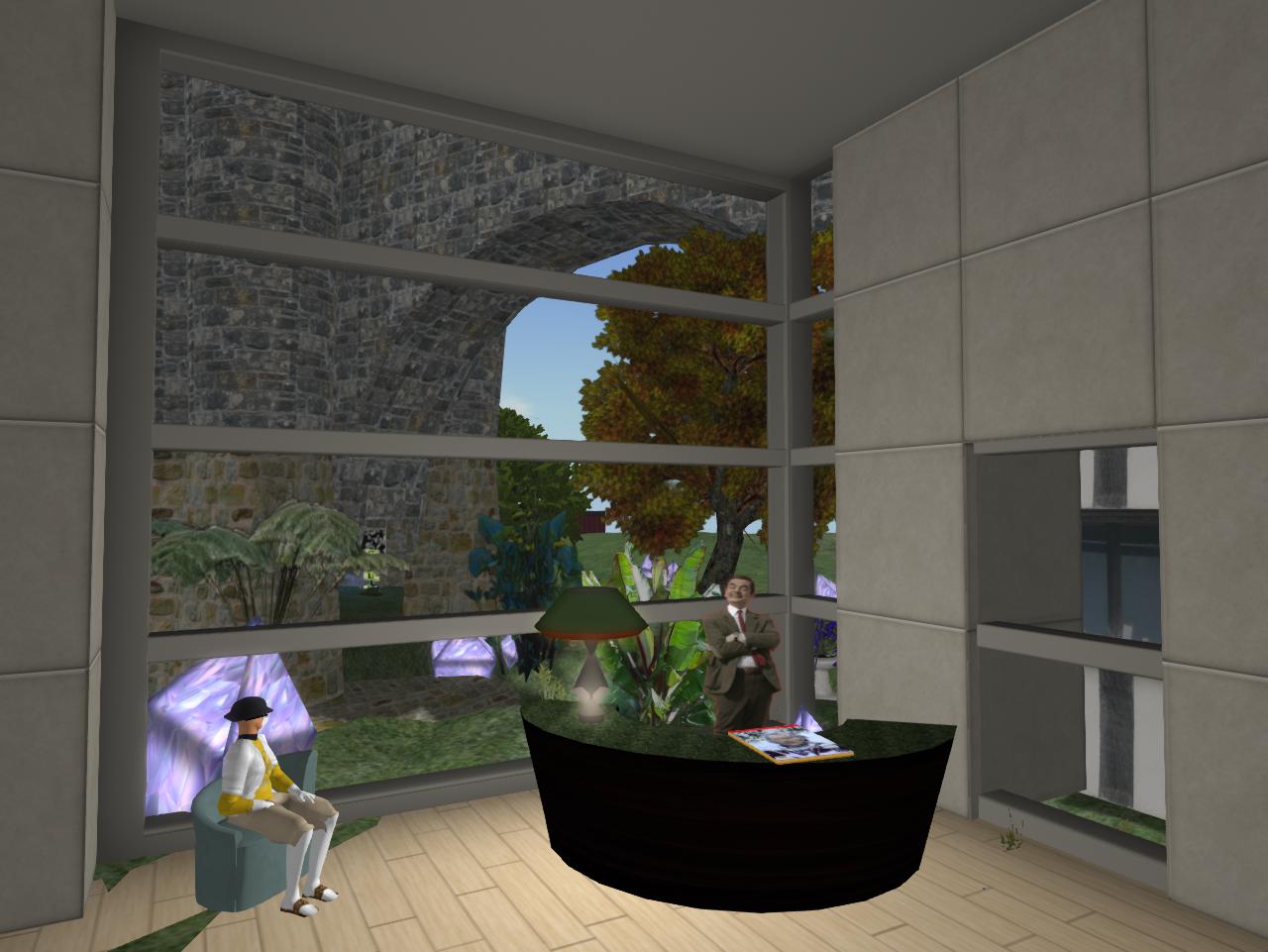 In the same room with these doubles in the present collage appears a silver-y fish on the floor, apparently dead, and also a hummingbird hovering in the air directly above it. This seems tied into the idea of death (fish) and then resurrection (bird) once more. And I should add that the floor in the next room reminds me of the patterned zig-zag one of David Lynch’s Black Lodge. Could there be a direct relation?
