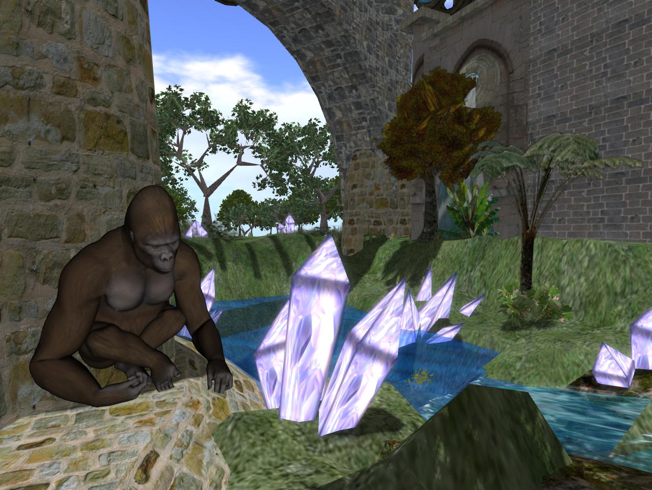 And speaking of Hucka, we also find him in the present collage beside Truman in his true Second Life form (“Hucka Doobie”), and not as a doll as we’ve seen before in Boos collages 11 and 19. We are moving into something truer — Truman. And in the background, standing in the grounds of the old Tungaske church and school we’ll see more of in coming collages, are two giant green, alien type figures both removing their heads. Hucka Doobie appears to be staring toward them. We know from the Falmouth series that these are 2 “Beemen” who show up in a Whitehead related collage here: