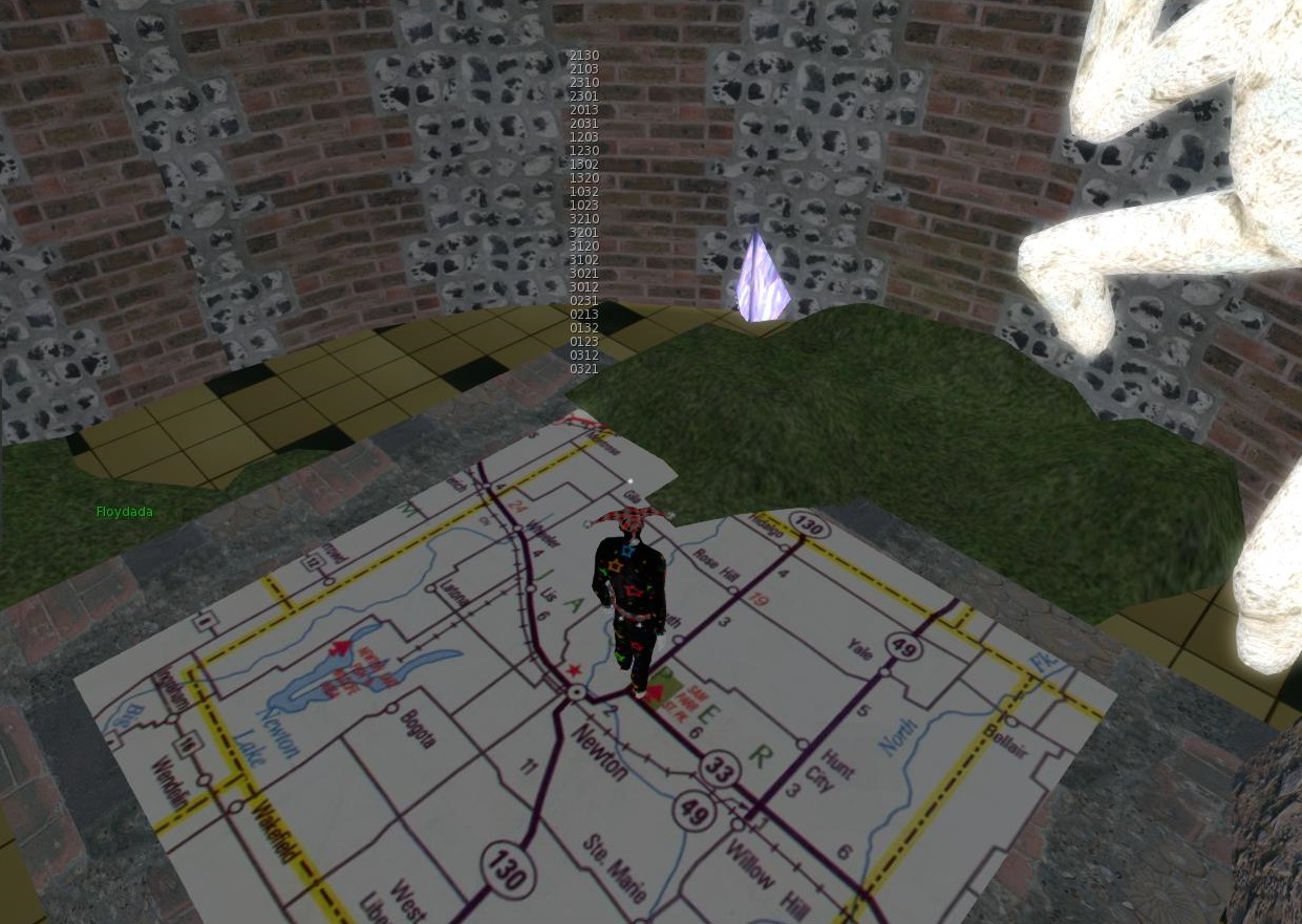 … this is the deal *now*. Carrcassonnee has been removed, *once more* from the TILE Temple, which has also been derezzed from Collagesity. She’s *back* in the gazebo wedged between the Boos gallery and Castle Jack for the second time, but the Eternally Bickering Newton and Jasper remain, along with their map. When Carrcassonnee desires to be “in”, her lemon will be burning outside the gazebo and she, along with her dog Spider and a couple of other objects, will be present within. When she’s “out” or “off”, I suppose, only Newton and Jasper and their map will be present in the gazebo. I, baker b., toggle these characters on and off by making one or the other 98 percent transparent. They’re already phantom.