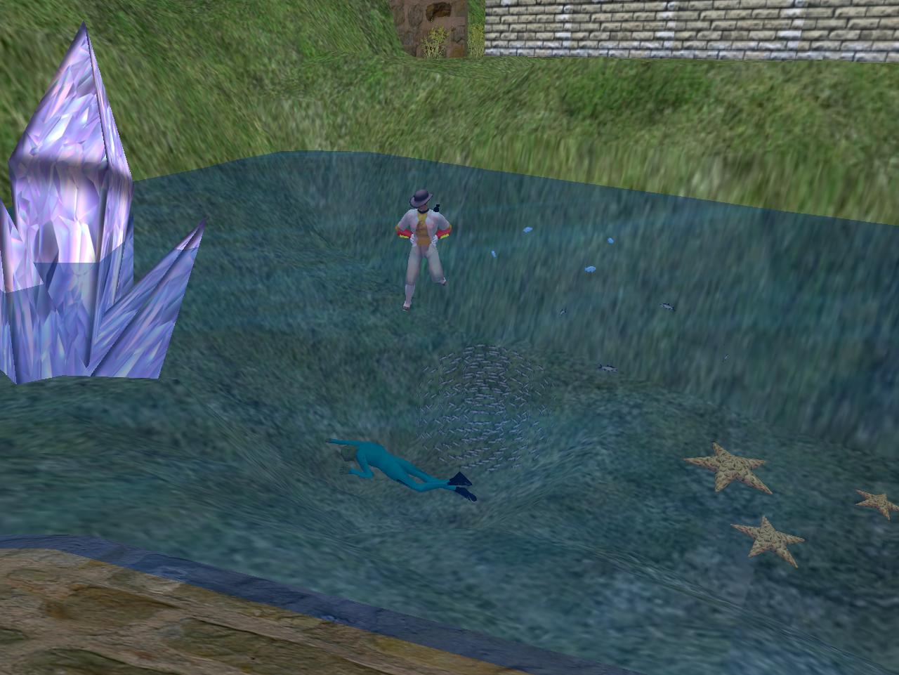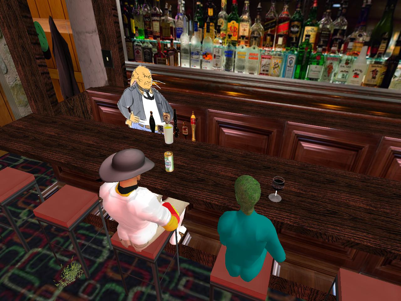 Baker Bloch and Furry Karl talk into the night about town business. Afterwards, Baker walks out of the bar to find Karoz Blogger at the bottom of the pool just outside. Drunk and asleep, not dead, because Second Life avatars don’t need to breathe air, of course. Sleeping with the fishes, still.
