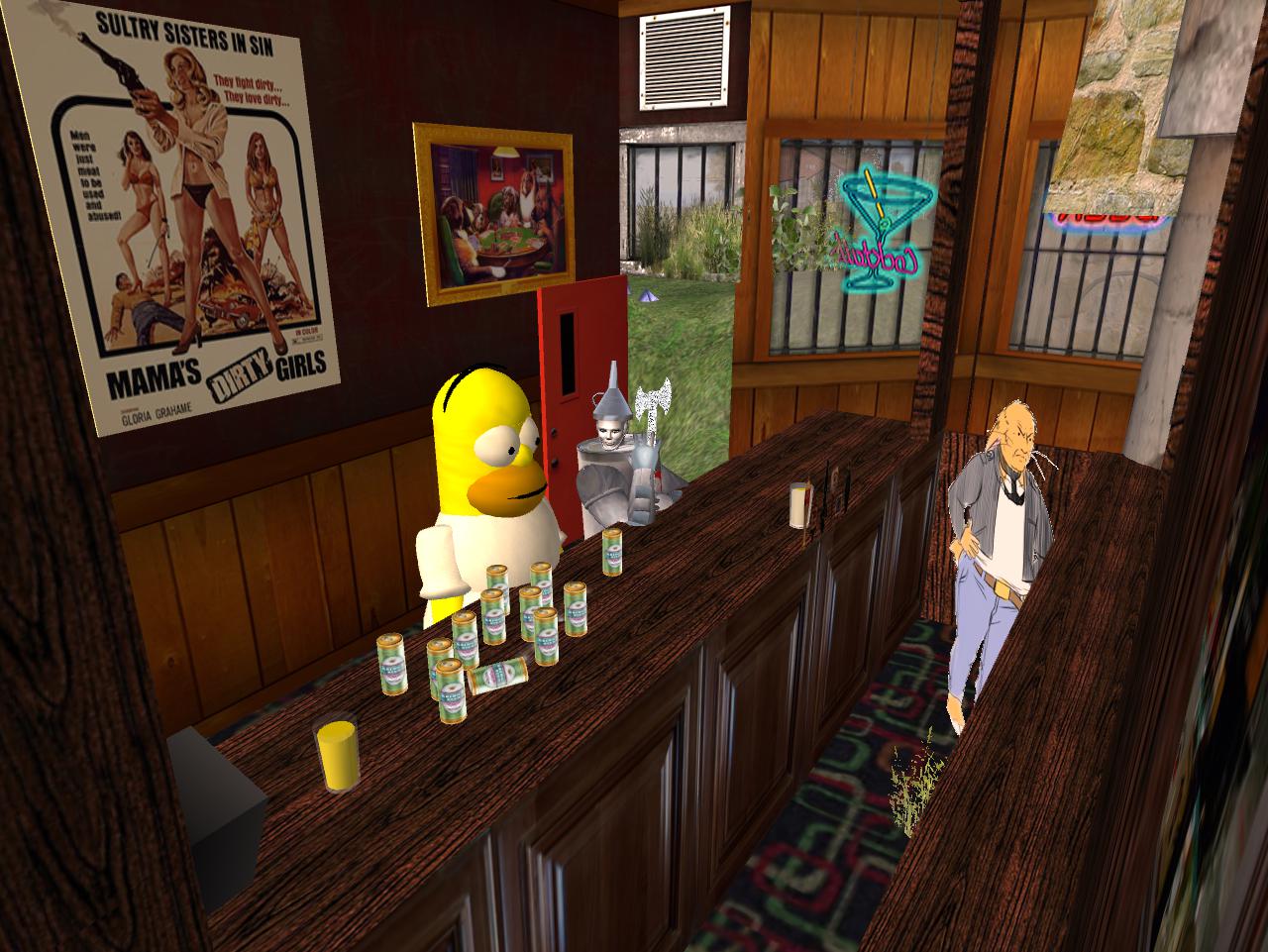 Karl looks toward Homer. “How about you, Homer? I guess you’re still missing your cartoon family, eh? Carrcassonnee told me yesterday that she’s actually your girl Lisa. She can do things like that. Go way back in time and inhabit tv characters, even animated ones. You may also know her as Fitz the Mouse from the short lived but brilliant ’12 Oz Mouse’. I’m in that one too!”