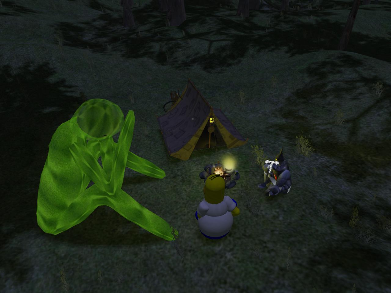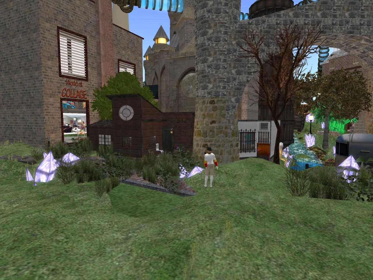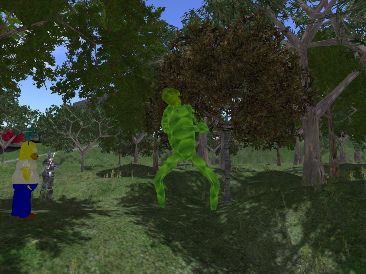 In other news, Carrcassonnee actually *did* walk out into the woods from the town stark naked, as Karl thought he made up. He’d really heard it from Karoz at the bar late the previous night, forgot it, and then twisted up the facts the next day in relaying what he perceived as a fictional story to Homer Simpson. The energy from the woods still has a way of scrambling your brains like that. In truth, Carrcassonnee (who is *always* “naked”, by the way) was testing out the new town shower set up by The Bakers in the 7th spire of Castle Jack right next to Karl’s bar, a most sacred place indeed now. It was a tight fit for the great olive being, but she managed to jam in and enjoy a most pleasurable shower indeed, the best she could remember. But toward the end she’d gotten some soap in her eye and wandered out of the spire through its now phantom prim and into the woods to the west, searching for a towel. Karoz saw her from its edge but was tied up at the moment, unable to help.