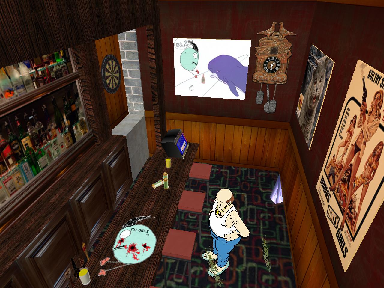 “You gonna order anything today, Karl?” asks Rhoda impatiently, his little stick arms protruding from below his oval, blue-green body per usual. He is a true flattie or cutout in both Real Life and Second Life — rather unusual. “‘Cause I got a business to run,” he continues in his slightly nasal voice. “A new business. Old Kent is looking over us all the time from… heaven, yeah. You gotta order something. You can’t just freeload in here. Load’s not free.”