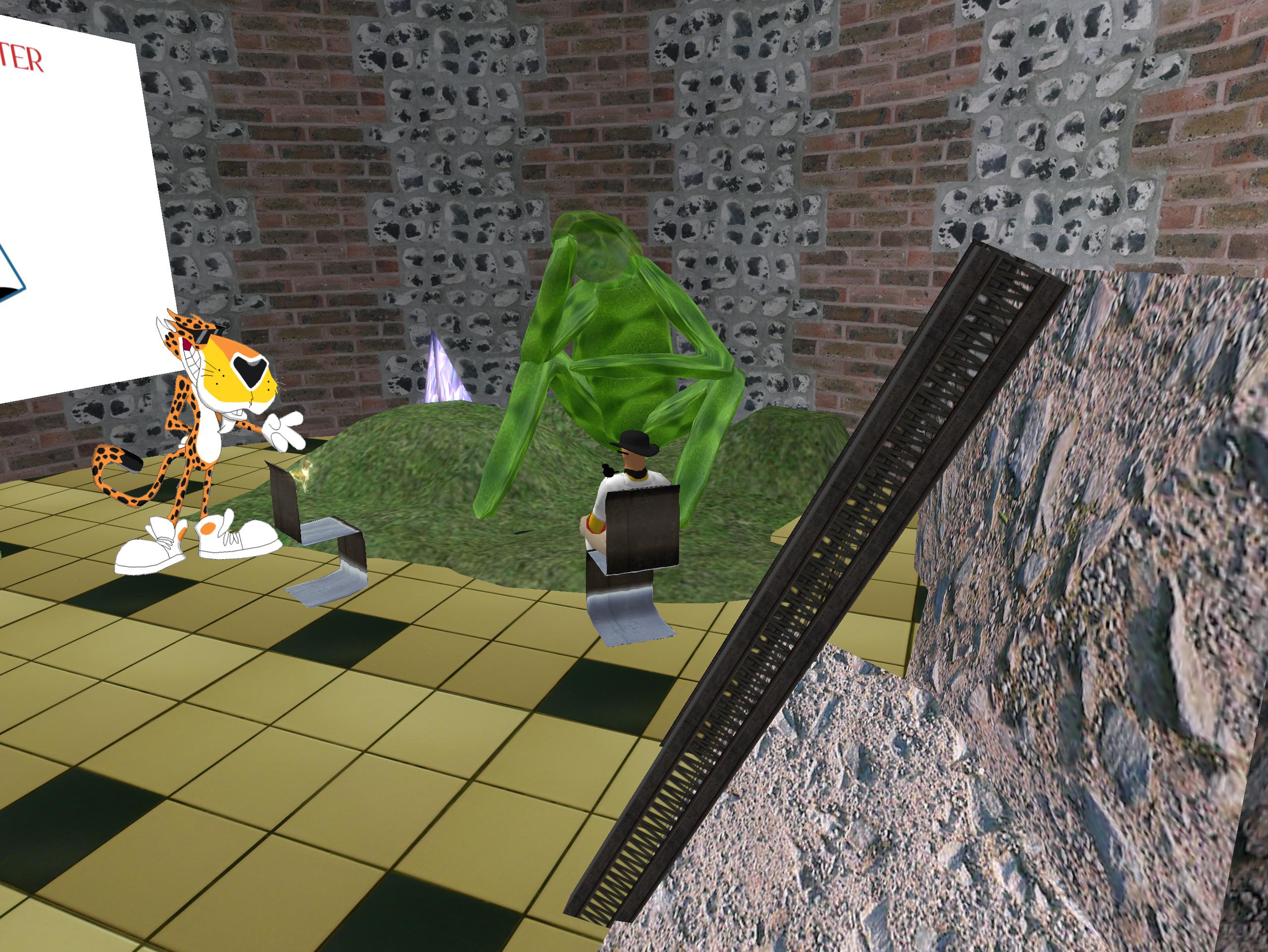 Baker wonders how this could be accomplished. The idea of making a “life size” replica of Bigfoot Swamp and surrounding roads crossed his mind, but he dismissed it as being too literal an interpretation, kind of like the error colleges do when they attempt to exactly recreate their real life campus and buildings on their Second life land. Second Life is not really about replicating what we have in real life, although that has its slot. It is instead mainly about the creation of the *new*, or should be. Collagesity looks little like a town in real life. It’s really a collection of gallery buildings in the main, but each building has a story.