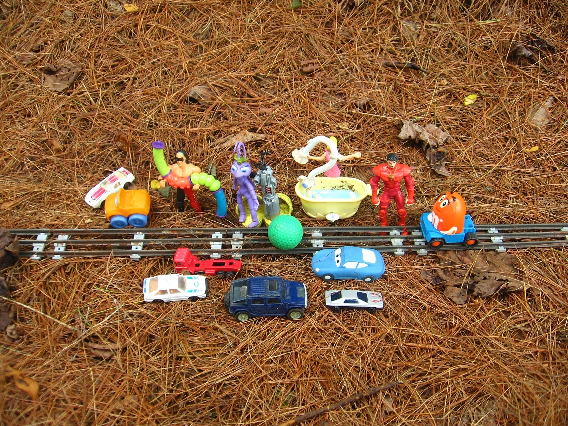 And even the toy avatars made an appearance on this day, posing below beside 5 straight pieces of the otherwise unused 027 gauge train track. A green golf ball appears in their midst on the track, harking back to the winning Greenilocks marble from last fall’s Bigfoot happening. There are other, familiar faces from that woodsy event, including the double to actor (and Warren Wilson alum) James Franco (red suited dude to right) and his biggest admirer, Ms. Orange Mmmmmm (to his right). Arms-in-air woman, another Bigfoot acting vet, now seems up in arms about the manifestation of a working bathtub and shower. “What the f?” she might utter here. The fronting cars are just happy to be pulled out of mothballs.