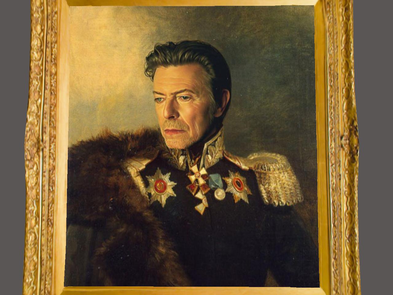 Dodging the nuisance, Baker then walks into one of the village’s small shops to discover this David Bowie painting.