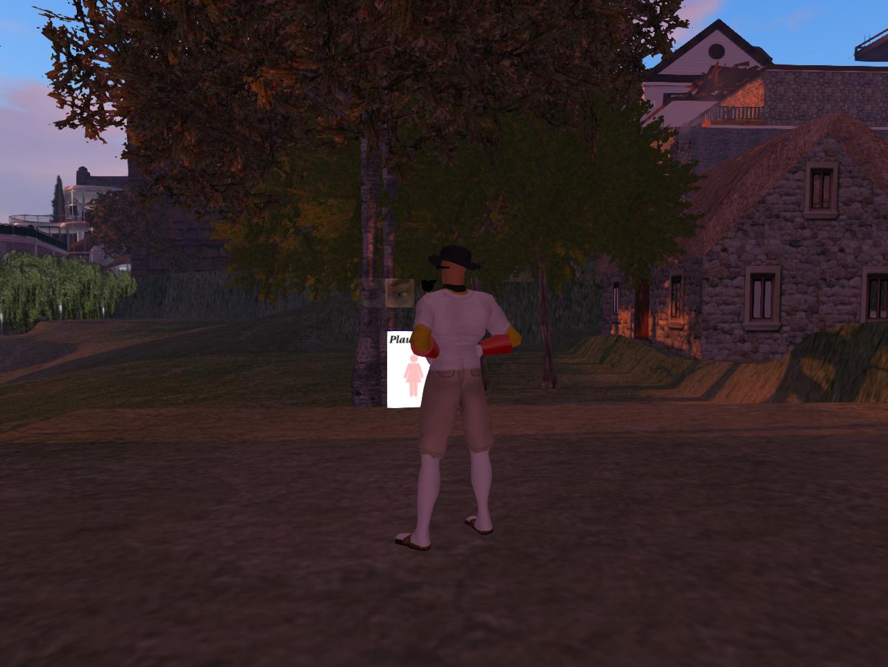 More cats awaited Baker outside the garage. At least some of them were present during the family’s last trip, according to photos from previous posts. But the one in almost the exact center of the sim — quantum cat as we’ll term him or her — was definitely not there. Here’s a comparison picture with John Lockfry 02 showing an empty table from, at the most, 3 or 4 days before. JL2 stayed at that location long enough for the cat to appear, since I took a number of photos trying to get his hand just right in projecting through the yellow sign to the other side with the 10×10 collage of pictures. But nothing else in the immediate area had changed.