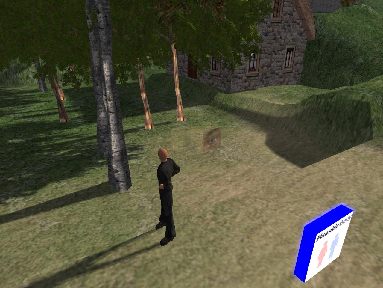 The door was missing; then, after a reboot, merely closed. He opens it to find that central cube again. Oh the magic of Second Life.