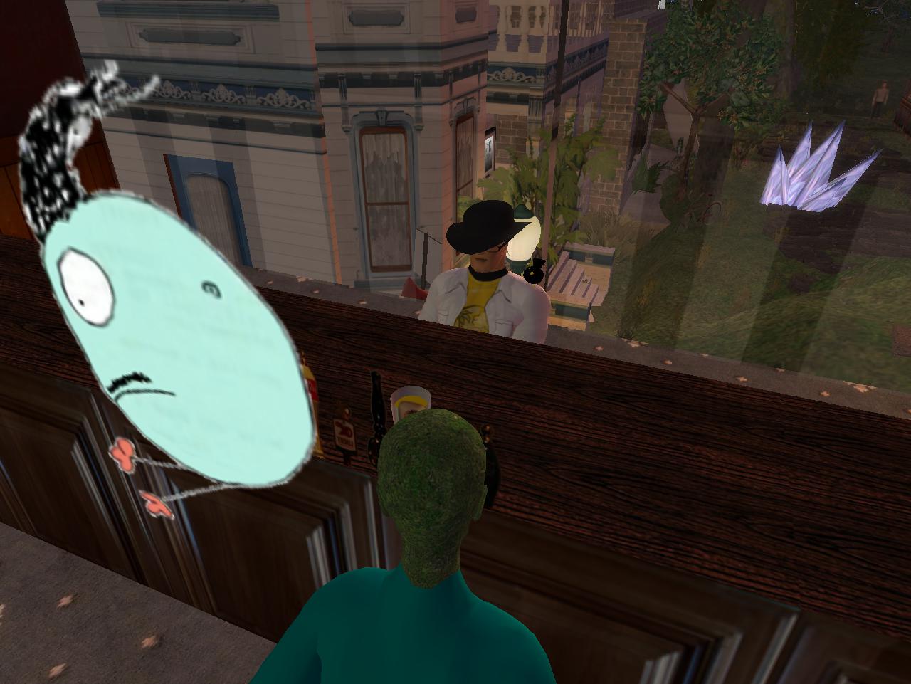 It was weird. Karoz manifested as a 2nd barman for the lower bar. We had to begin again. Wait! Baker Bloch crashes out of Second Life. Karoz is able to switch from server to served. He checks the picture beside him to make sure it was the correct Rhoda.