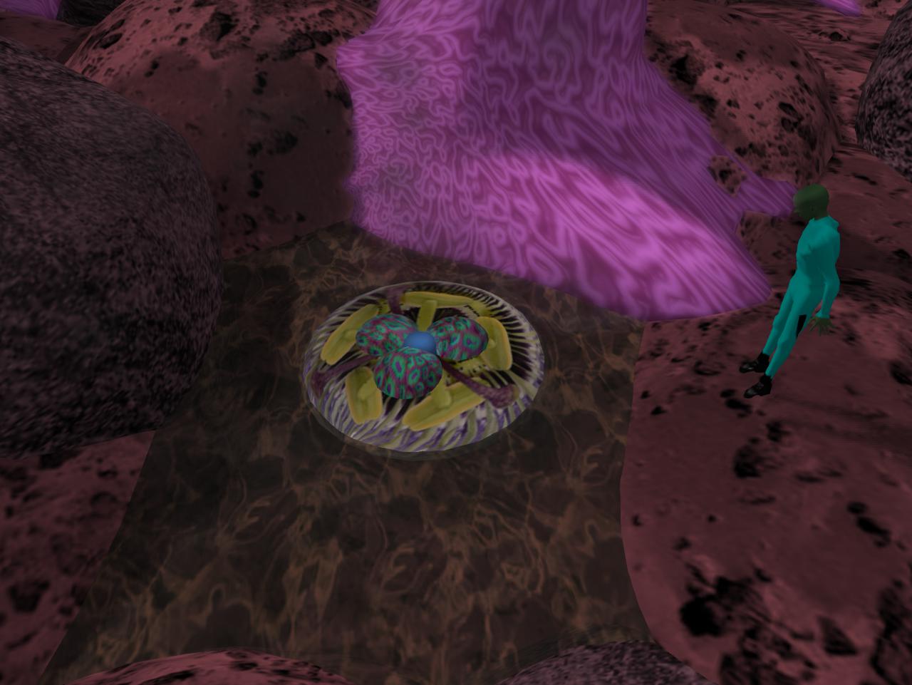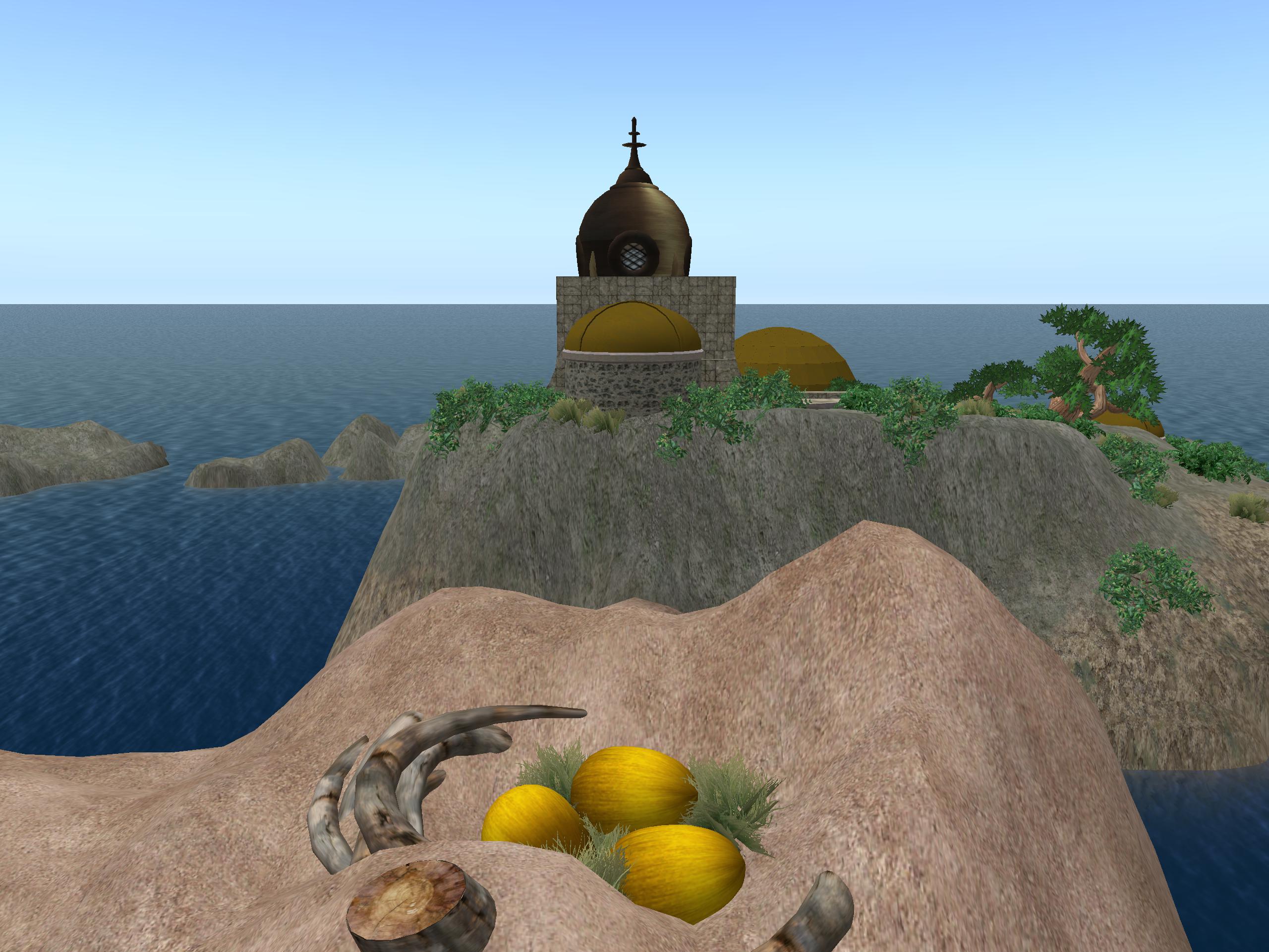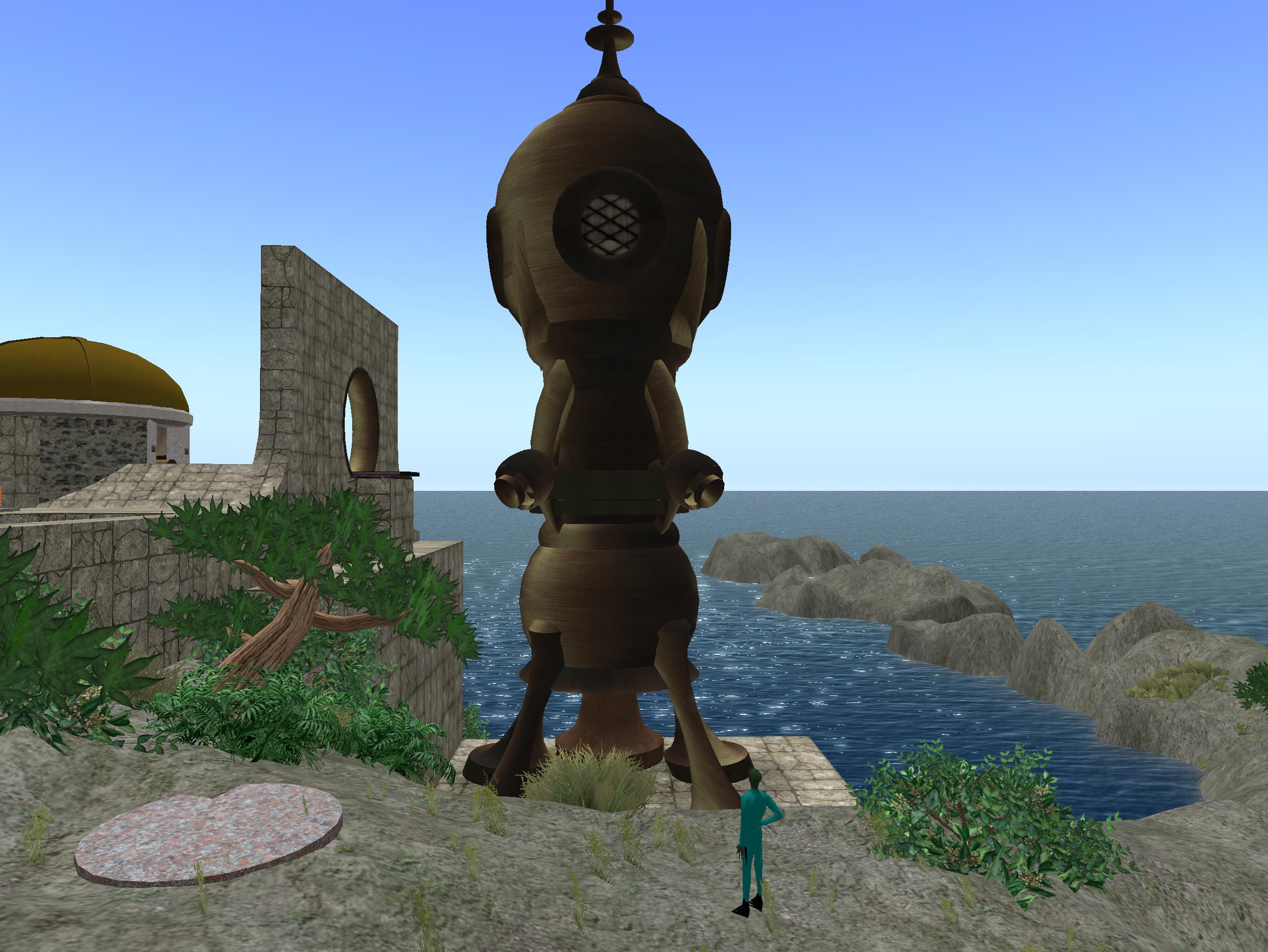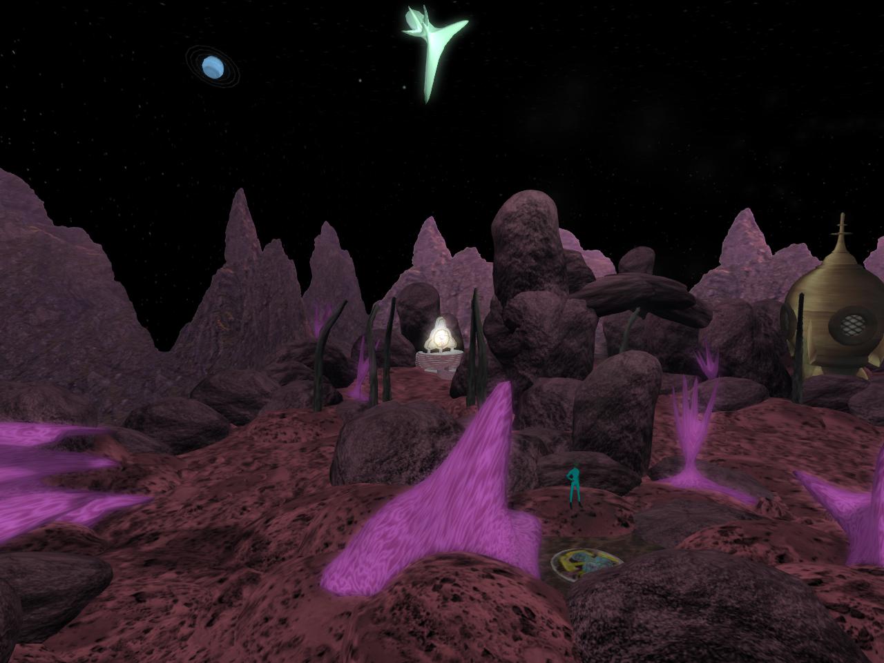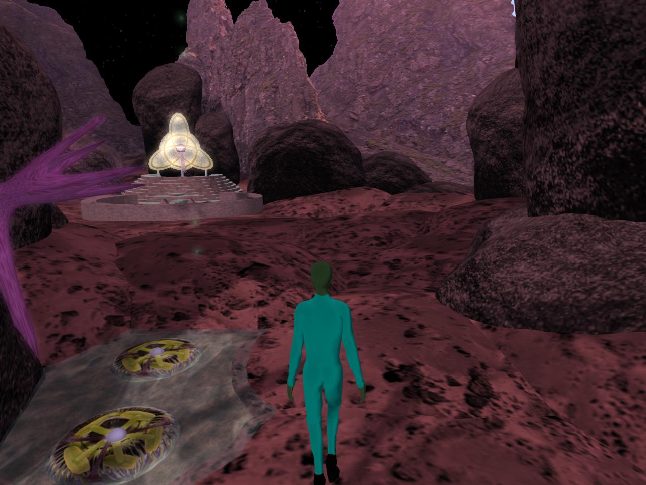 Lemons? This is a Linden build but older powers could be active here. Okinu is one queerly cool sim, after all, with an interesting history dating back even toward the beginning of My Second Lyfe. Sometime, maybe 2011 or 2012 (hafta check), Okinu got a complete makeover from its former 100% water status to become part of the new Sea of Secundus, dotted with islands such as the one the rocketship sits upon. The meaningful glyphs were eradicated in the transformation. Shame. But maybe they live on in a manner through the ship and the faraway world it leads to. To Karoz, this was Mars. He’s been 3 times. The great 3-n-1. However, Wheeler is now saying it *isn’t* Mars, but to check the 2 Saturns in the sky still. One of them — the real one, she says — can be used as a conduit to deeper space. Maybe going all the way to Muff-Bermingham.