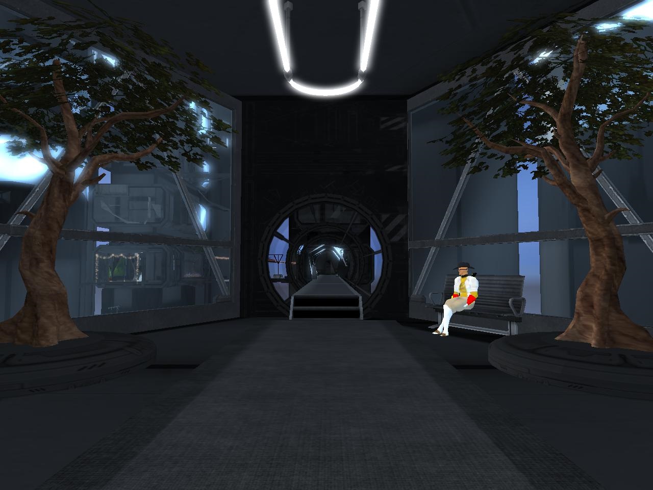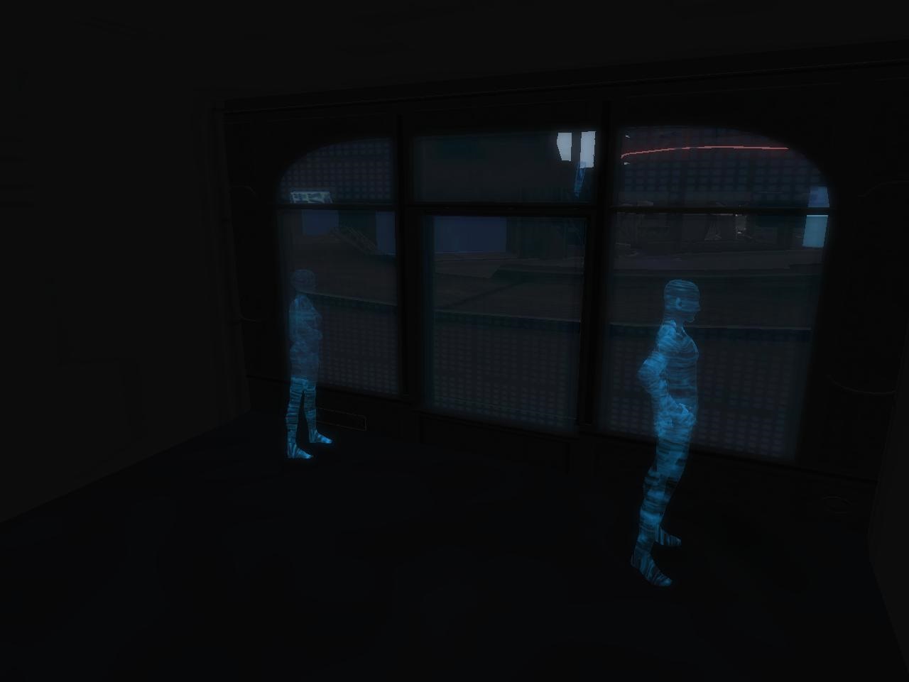 Blue cat, blue beam, and hooded man at INSCO Central.