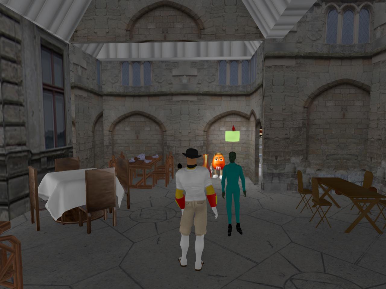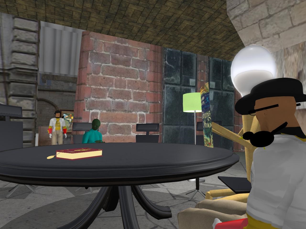 “And to take notes,” Baker realizes. “So the lamp will have to stay. Tell you what, let’s replace it with the standing Kubrick light like the one downstairs. Hold on and we’ll see how that looks…” Baker copies the standing lamp from downstairs and rezzes it between and behind Hucka Doobie’s and Curled Paper’s seats. “There. That could do.”