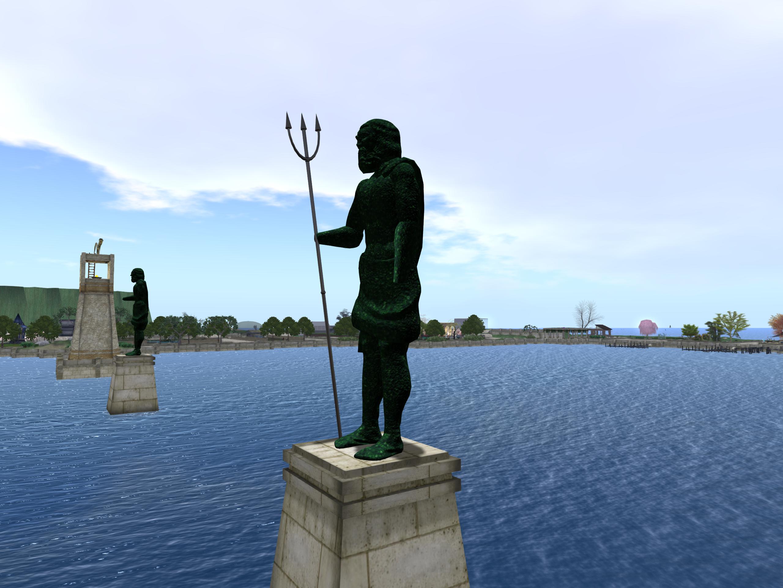 Standing Poseidons guarding the Nautilus City harbor about 3 sims east. These are about 2x the height of the ones in Sicorathi.