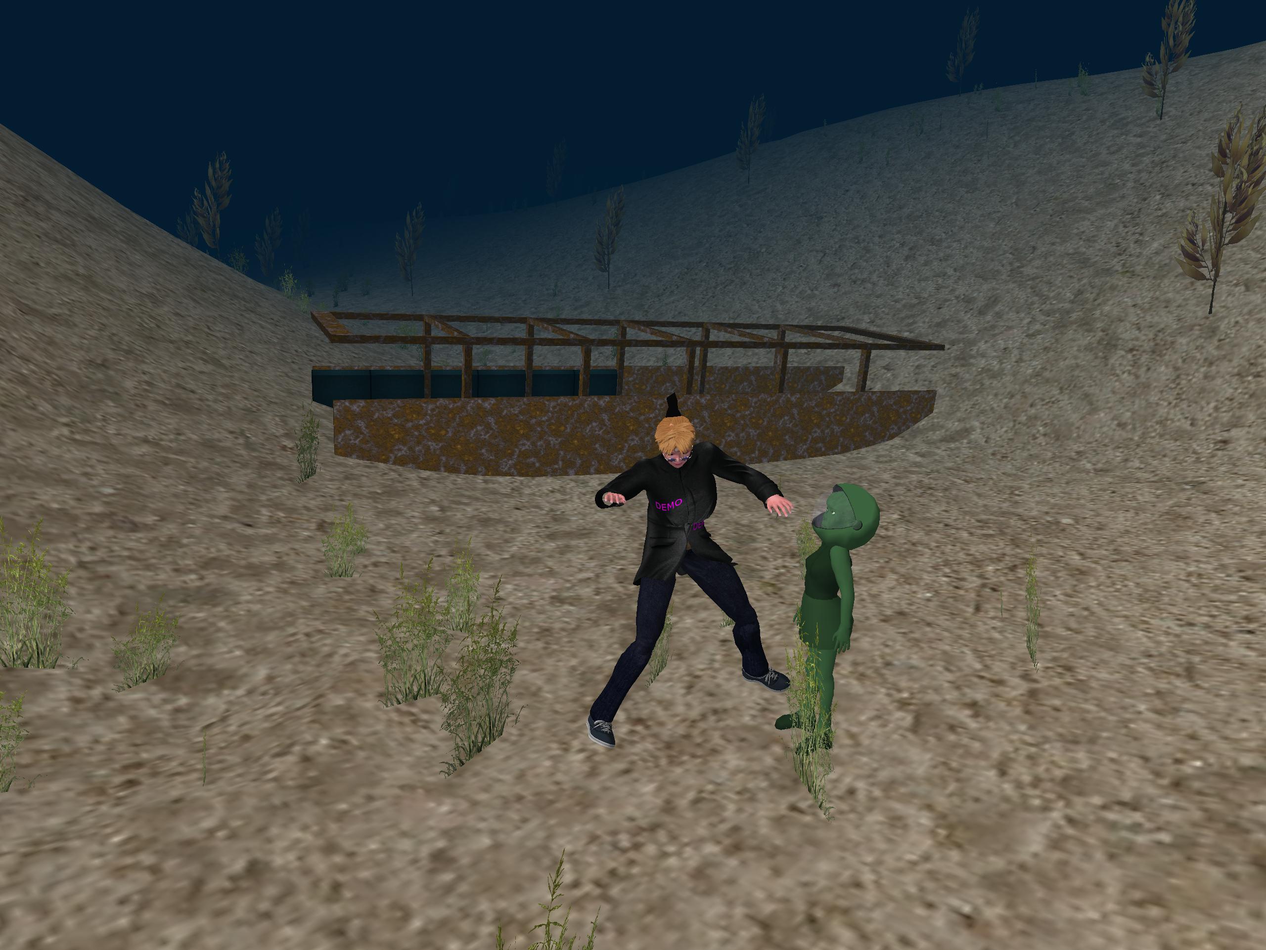 Avatar sitting on a prim depicting two bird shooting motorcyclists. This is, of course, a still from the legendary British sci fi comedy series Red Dwarf. You did know that, didn’t you? It’s cleverly positioned within the Hipper rez zone of the North Sea. The avatar merely rezzed the prim and then sat on it to keep it from derezzing. He can sit there as long as he likes. However, upon standing up the prim would instantly vanish.