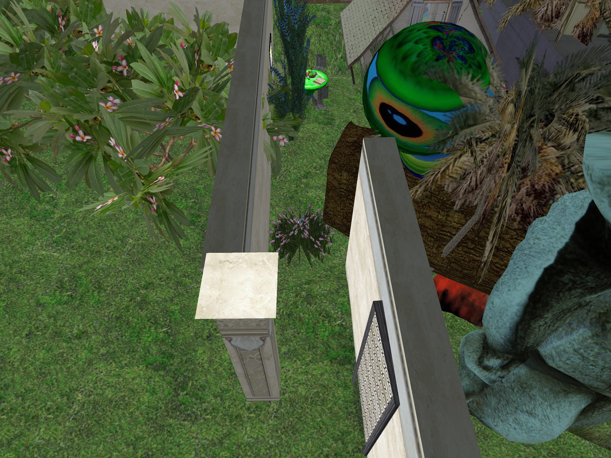 Turns out the marble hands left behind were only a prop. And now Old Mabel, in a dream state, has uncovered the accompanying stone head. But she can progress no further tonight, although she caught a glimpse of this green table just beyond the entrapping flowers.