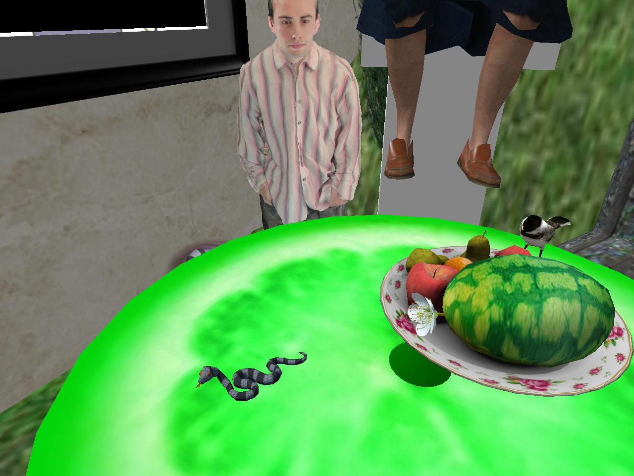 All look down at the withering serpent. The bird on the plate seems to eye it almost hungrily.