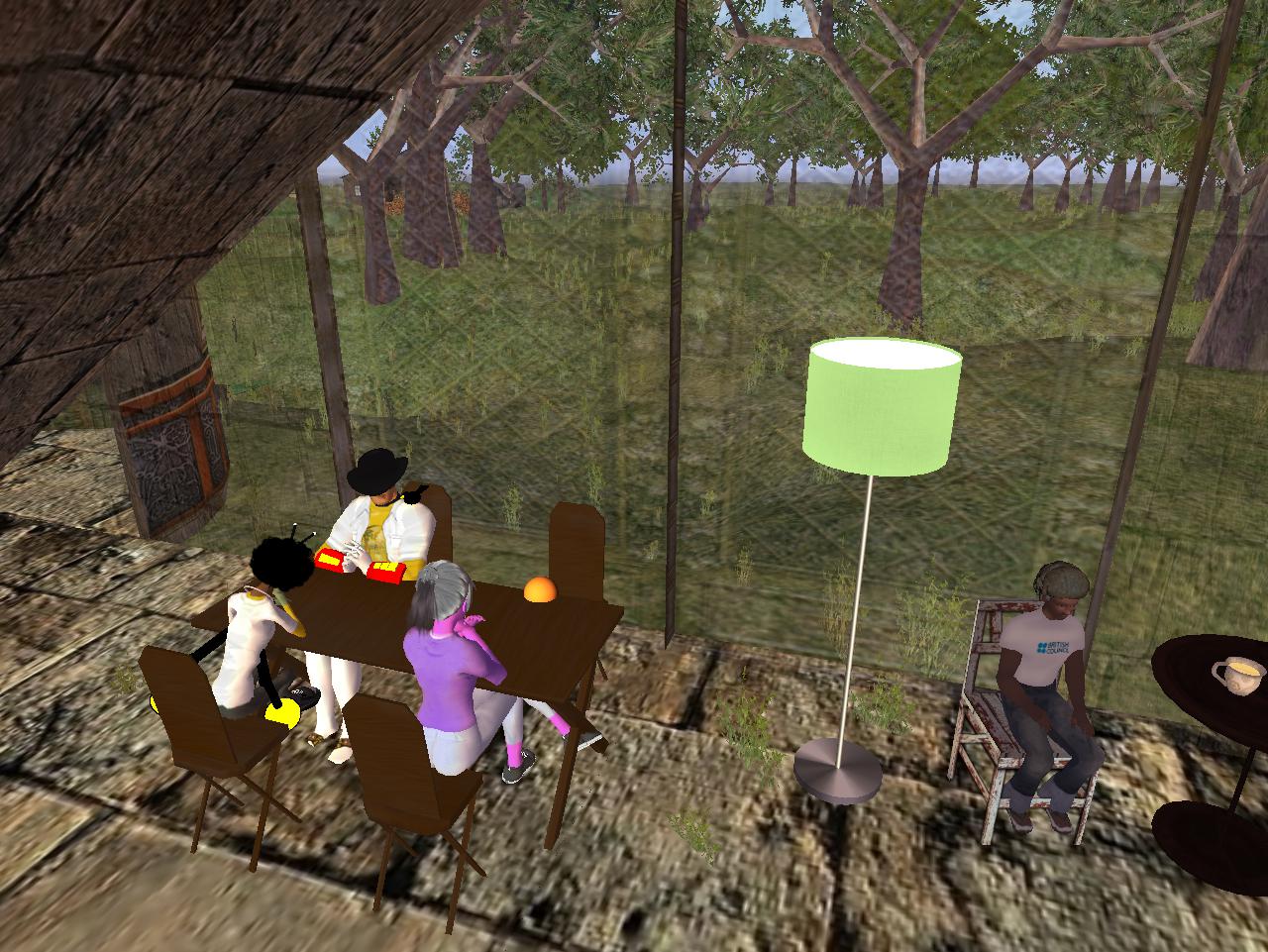 “Thanks for sitting down here for a change,” said Baker after they had arranged themselves around a table on the bottom floor of the Blue Feather. “I’ll take one of the seats looking away from the forest since you two were so agreeable. But isn’t it beautiful?” He glances at the forest over his shoulder before unrendering the trees and grass to decrease lag. “I missed it, even in the short time I was away.”