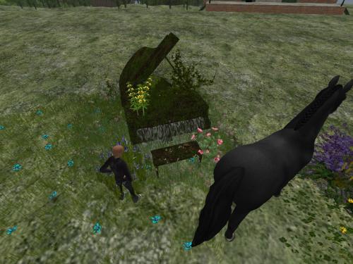 Meanwhile, The Musician had given up attempting to play the nearby odd piano. Spilling water for keys. Stringy plants for piano strings. The American Standardbred horse Enola EM looks on amused.