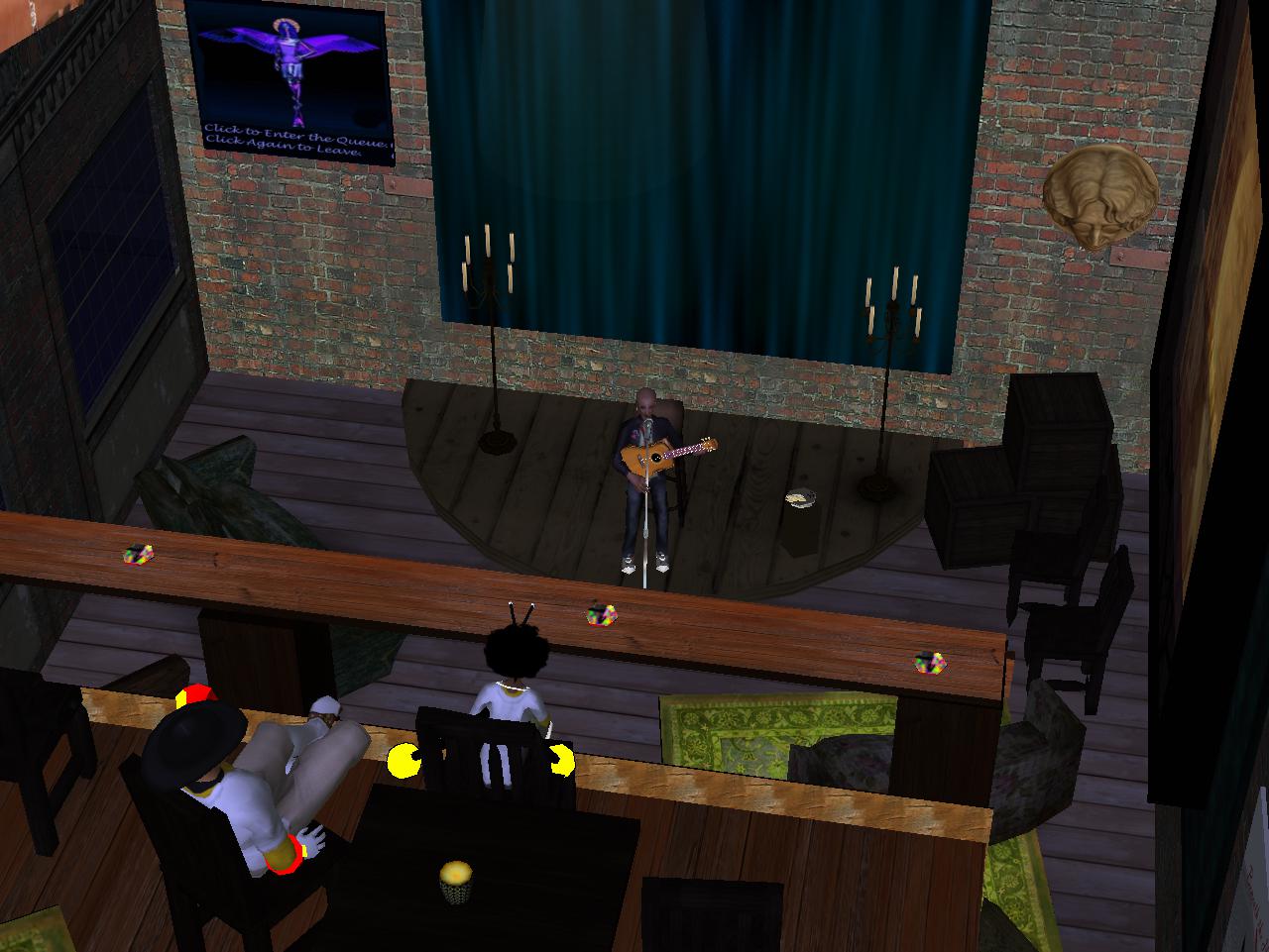 “I’m not sure I like it as good as News and Views for a hangout,” whispered the bee-person to Baker Bloch while The Musician continued his crooning. “Nice song, though. Who is it?”