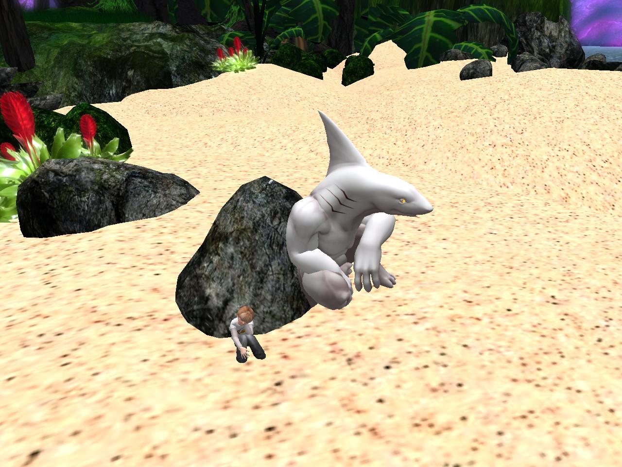 “No use, mister. That’s the end of *this* realm. Realm of Bermingham.” The boy waits for a logical response but still gets none. He begins to understand that this man-shark might be a little slow as he watches him continue attempting to break through an impenetrable barrier. Not that he judges — just an observation. “You might as well stop,” he repeats. “You’ll never get past it. Come on up to the shore here with me. Talk to me. Tell me who you are and a little about yourself.” Yes, the kid was much wiser than the grown-up in this case. He was use to being a counselor for the confused.
