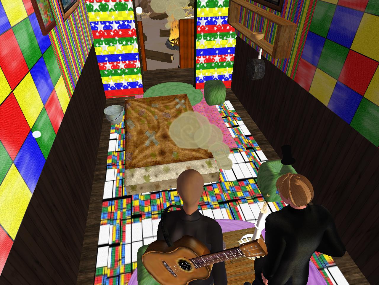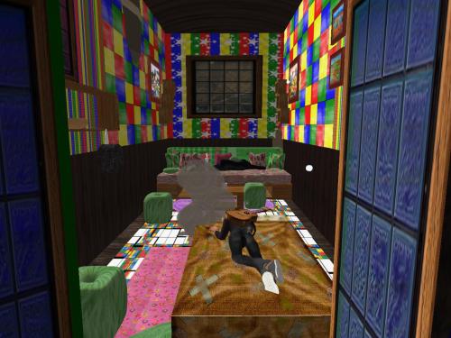 Just beyond their view from the inside, Morris waits paitently for them to come out and discover his presence. “Boy these clowns sure burn good,” he exclaims while watching the fire grow even brighter. “12 prims saved right there.”