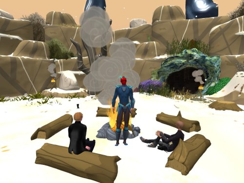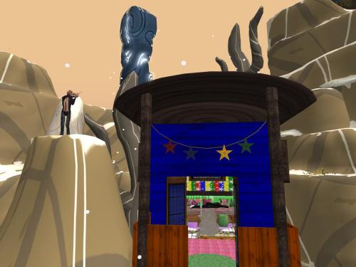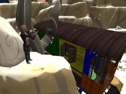 The Musician woke up Wheeler the next day to the tune of “Seven Nation Army” by the White Stripes, played on a gothic violin purchased in a VHC City music store several days back. He’d been saving up for months. And he’s already dubbed the steep hillock he plays upon in the above picture Fiddler’s Knoll, a natural perch for such creativity. As fine as the musician is playing, and as interesting a song as he’s covering, Wheeler still awakens upset. She had no water to bathe with the night before. All the scrounging around the various corners of their compound — nay, their *prison* — had produced basically nothing of interest. And they were unable to scale the walls to see what was outside. No flying here as well. Trapped. But today was another day and perhaps Morris would return and give them more information.