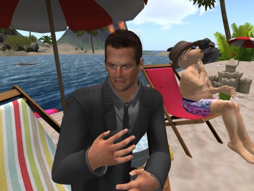 “Better lather up for the sun,” he suggests to Caucasian Tommy Brade while applying yet another layer of suntan lotion himself. “Ozone hole’s not getting any smaller, ya know.”