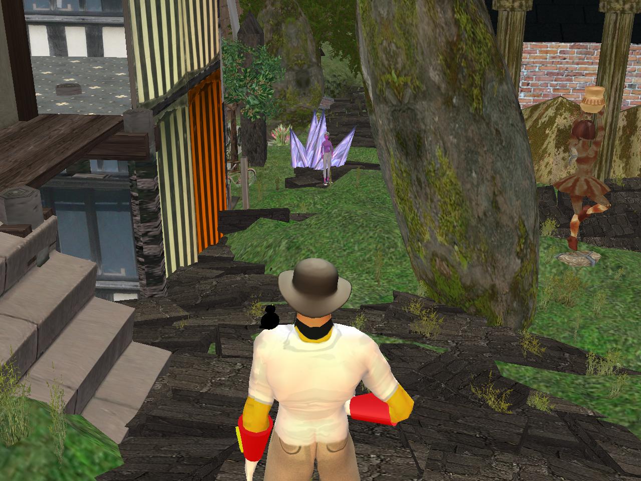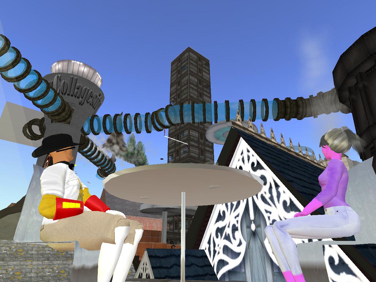 I’ll just summarize what was discussed at this meeting between the two town owners. Pitch has not given up on getting back together with Mary, but sees her in a very different light now that he keeps visiting her creator’s home over in Clemscott and pokes around more. Such a bizarre place, Baker Bloch tells Baker Blinker. Pitch can’t figure it out. Then, of course, Baker Blinker herself wants to see, which I’ll get to in a little while. Karoz is growing weary of life in Chilbo now that his favorite coffee and sweets shop formerly located in the Stinna Biddle Gallery there has been derezzed. They may be moving back to Collagesity; Baker Bloch gets chills with this news. Rocky Racco has returned from the Gulf War and sealed up the sand castle portal occupying his lower floor by having Caucasian Tommy Brade toss the owl’s head ring into the Ichelus volcano, thereby destroying it and Brade both. He said he got the idea from a popular Middle Earth book. The only proper way into *Middle*town now, Baker Bloch explains to Baker Blinker, is through The Kidd. They both stare over at the upper 2/3rds of the Kidd Tower again with this.