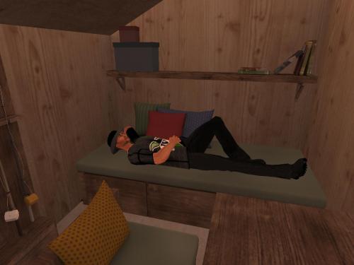 He teleports to the shack using the landmark created last night. An angler is positioned just a bit down the bank from him, seemingly of the female variety. “Hello?” he says. No answer — but this might be problematic. He wanted to be alone and smoke his grass and talk to his fantasy creations: Peanut Cop, Golden Josephine, and the rest. Away from that nonsense babbling Kid and tough talking Philip, somehow the best of buds now despite their different natures. He doesn’t want other fishermen — or fisherwomen — in his way. Who does own the shack? He desires it for his own, his own centre of the universe, he realizes, at least for a little while.