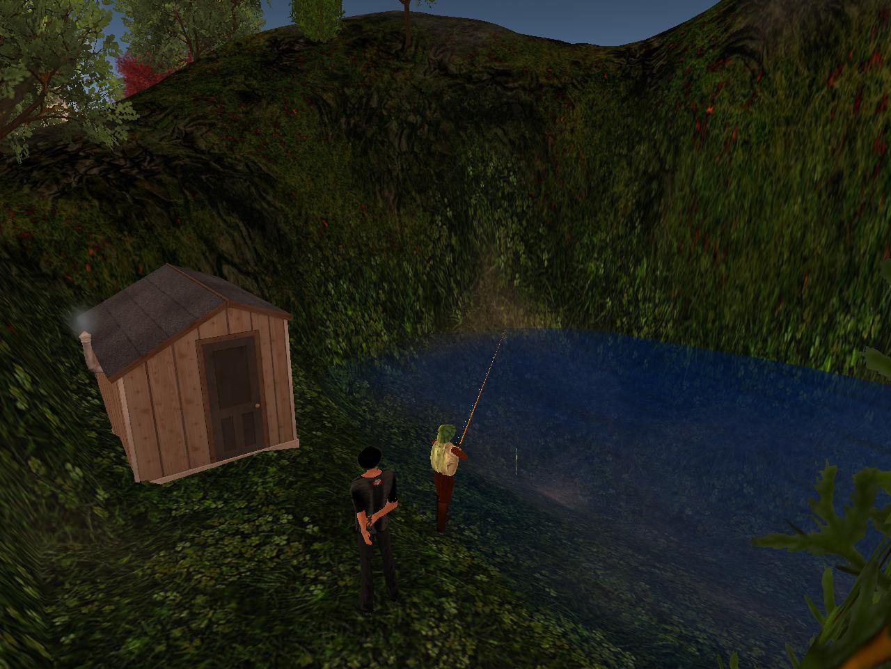 He teleports to the shack using the landmark created last night. An angler is positioned just a bit down the bank from him, seemingly of the female variety. “Hello?” he says. No answer — but this might be problematic. He wanted to be alone and smoke his grass and talk to his fantasy creations: Peanut Cop, Golden Josephine, and the rest. Away from that nonsense babbling Kid and tough talking Philip, somehow the best of buds now despite their different natures. He doesn’t want other fishermen — or fisherwomen — in his way. Who does own the shack? He desires it for his own, his own centre of the universe, he realizes, at least for a little while.