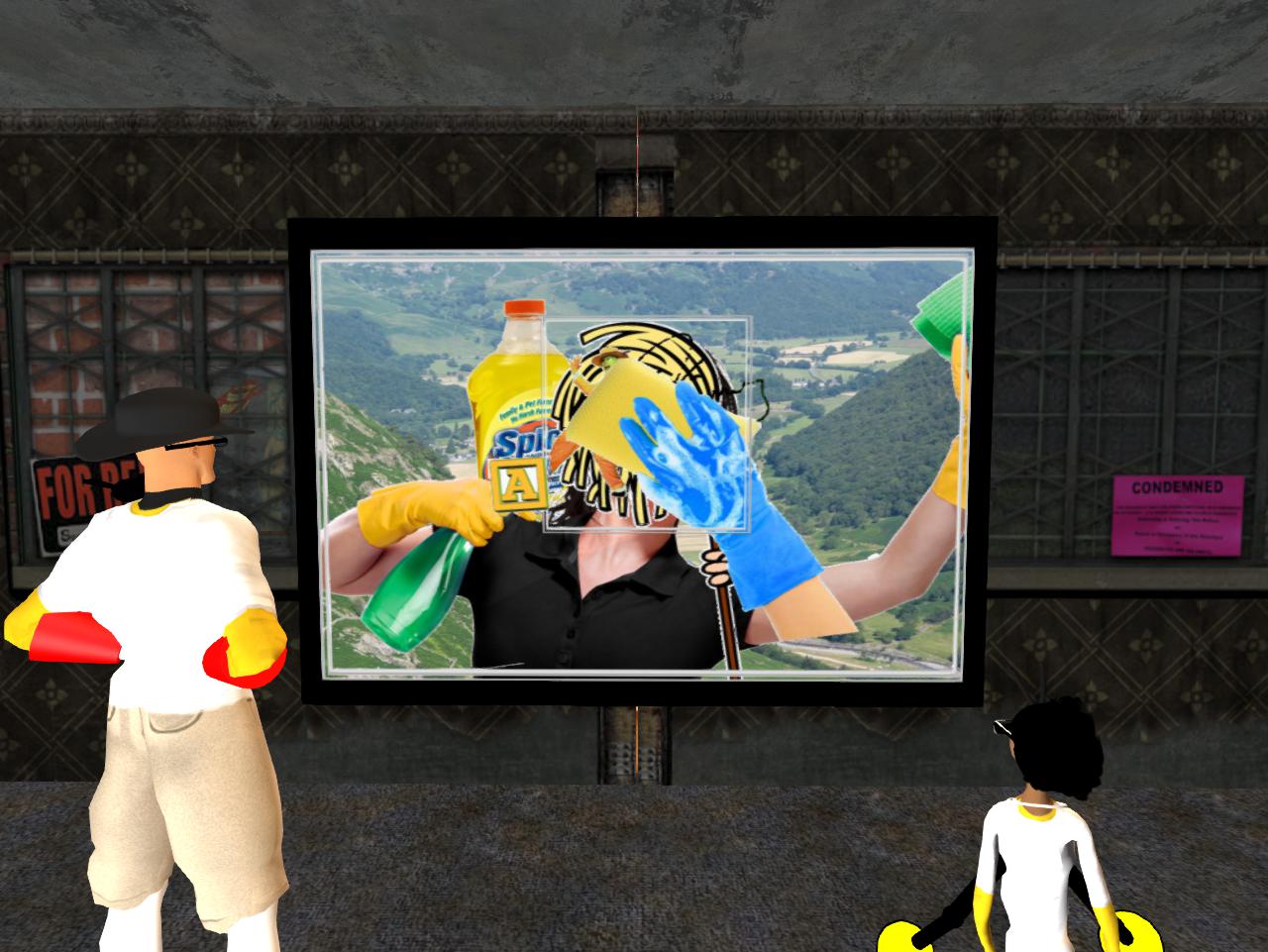 “This is obviously something being erased, a blonde woman most likely. Probably Laura Palmer of Twin Peaks fame. The yellow mop head acts as the hair, reinforced by the yellow cleaning pad wiping the face into nonexistence.” Hucka Doobie moves closer to the work. “The ‘A’ — the yellow block with the letter ‘A’ on it — seems to be a weakness. Covering (or blocking) chaos. Let’s see, ‘A’ is the first letter of the alphabet…”