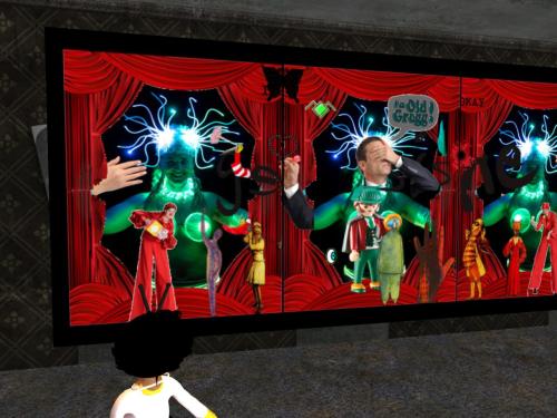 “Right. Burl Ives. ‘Heidi’. Mirroring tombstones. A green Oblong box passes between them filled with the letters of Oblong, none of which are green atall. You must follow the box.”