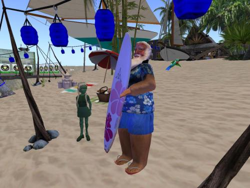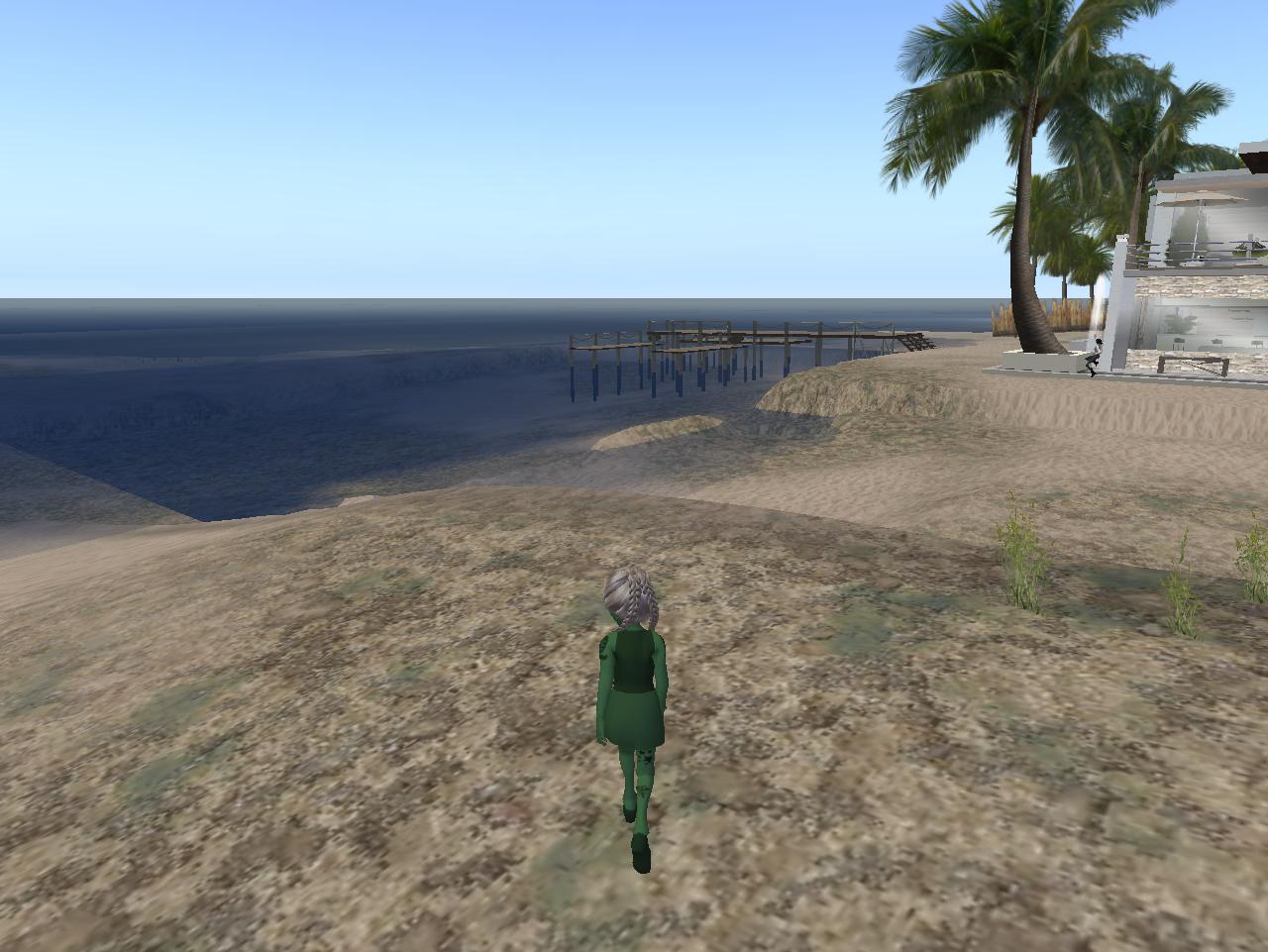 Mabel wanders back down the beach, toward the far side of the pipe. [Leemon’s?] Beach had been set as her personal limit in this direction. She couldn’t stay out too long — for Buurb’s sake. She spots Volkswagen Gurl leaning against the large, white house in the distance, but too late to turn around. Luckily the chatty lady went AFK before a potential engagement.