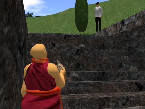 “No,” responds Sidechick Corea gently. “That would be Baker Blinker, who is married to Karoz.” He checks the sun, then quickly looks down at his watch while shaking off educational mode. “Dear Lord,” he cries. “I forgot about Baker! He’s maybe been waiting, oh jeez, *3* hours! School’s over, Campbell O’Pine. I have to get over to the Threesun sim. Pronto!”