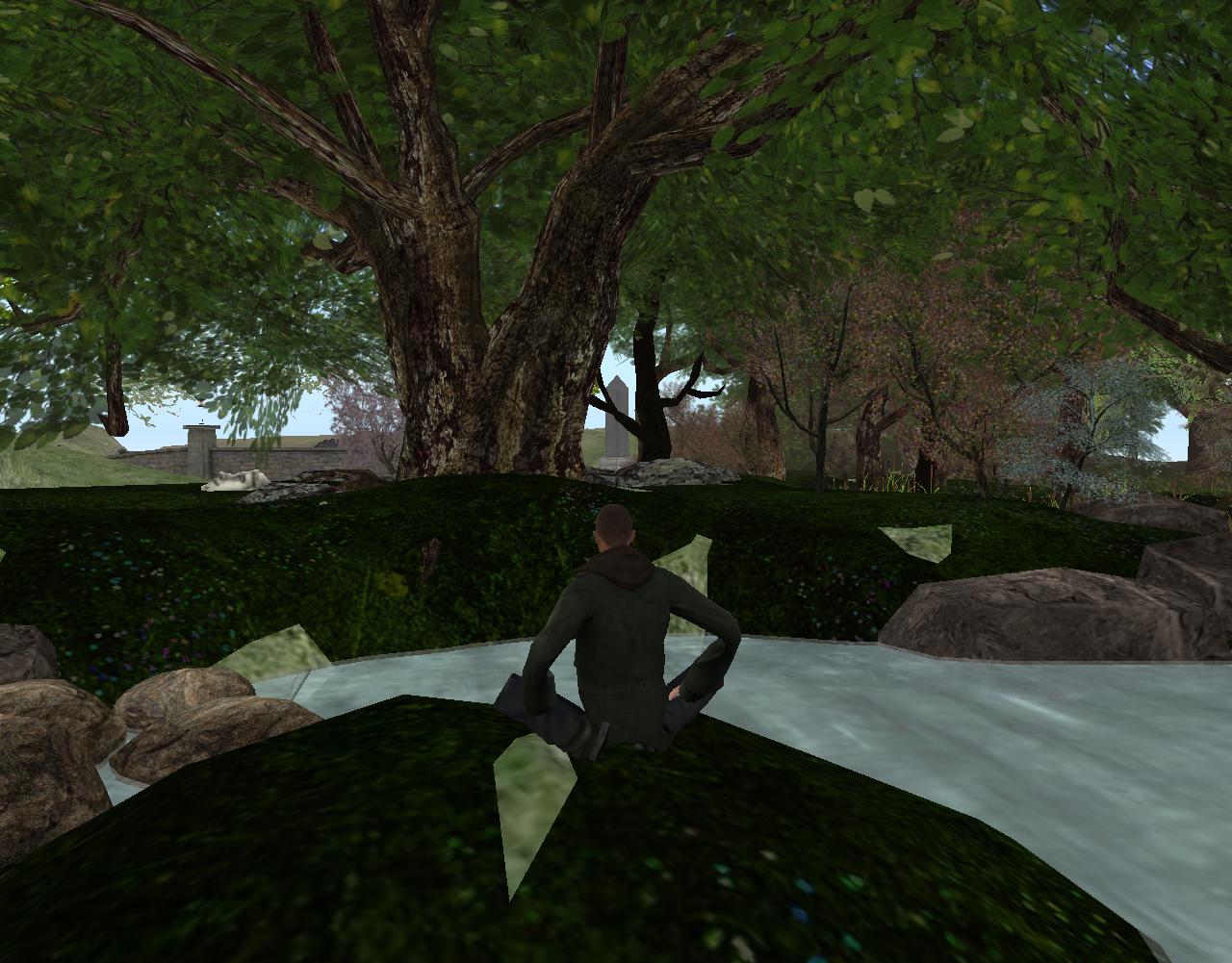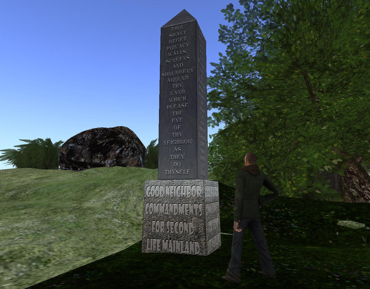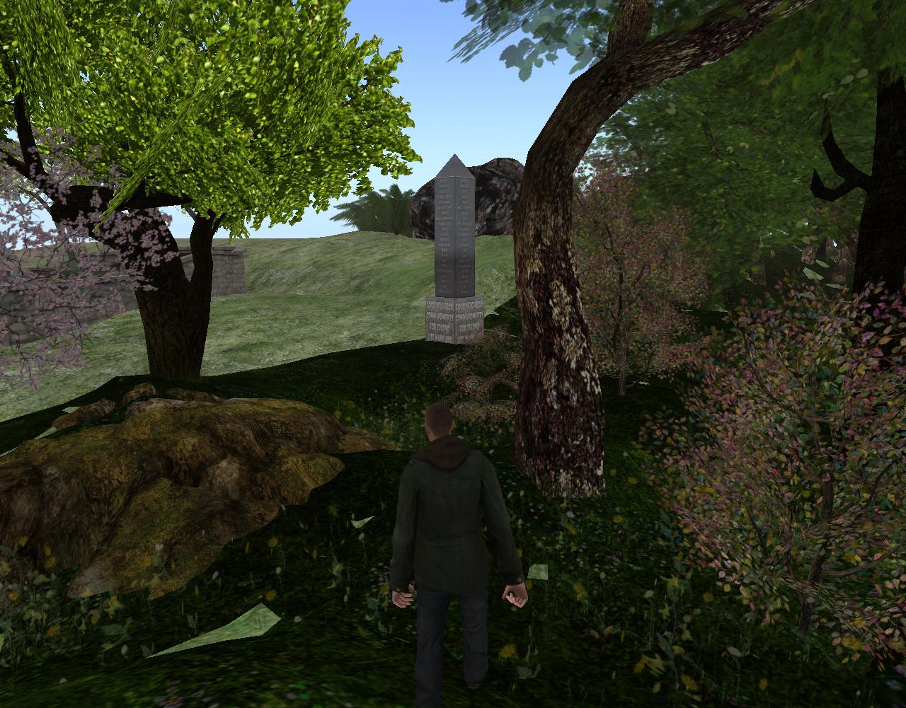 He stands up and walks toward the obelisk, situated on the southern edge of the forest. As always, he tries to follow The Diagonal in as straight a line as possible by keeping the first two coordinate points of his position the same at any time. Not as easy as it might sound!