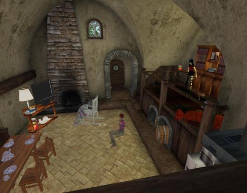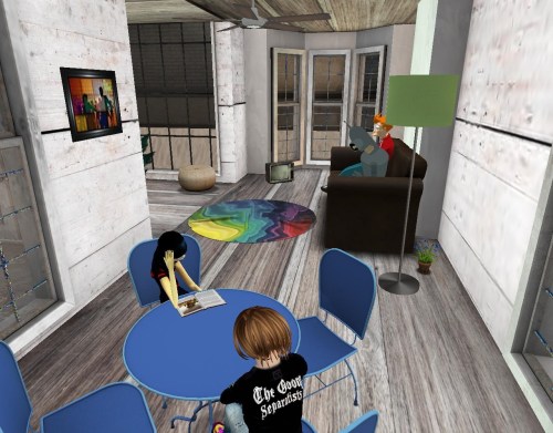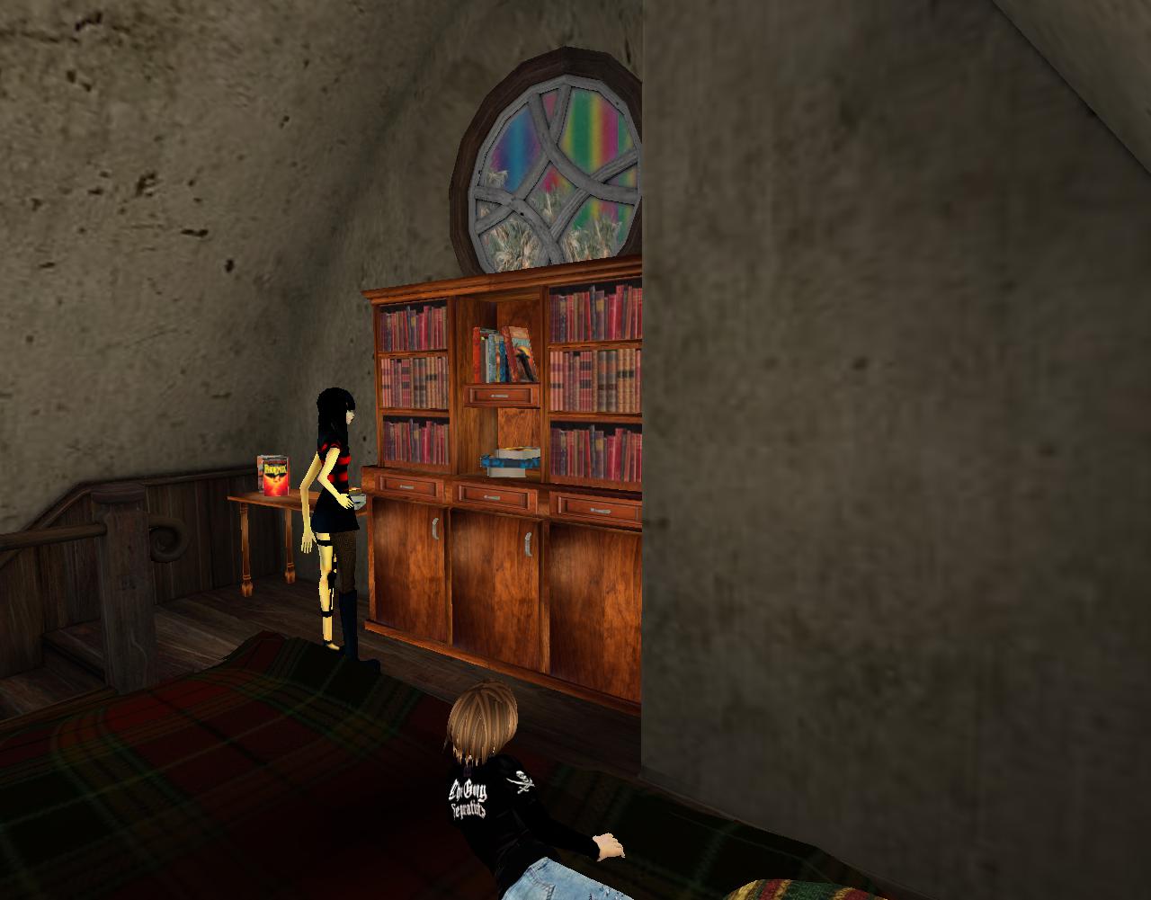 “It’s EM’s chair and that is that. It’s a portal thing… ‘nother one. But this raised floor, the books (she waves at the bookshelf in front of her), even the toilet over there just behind the wall… fair game. The table below us as well. It’s just the chair…”