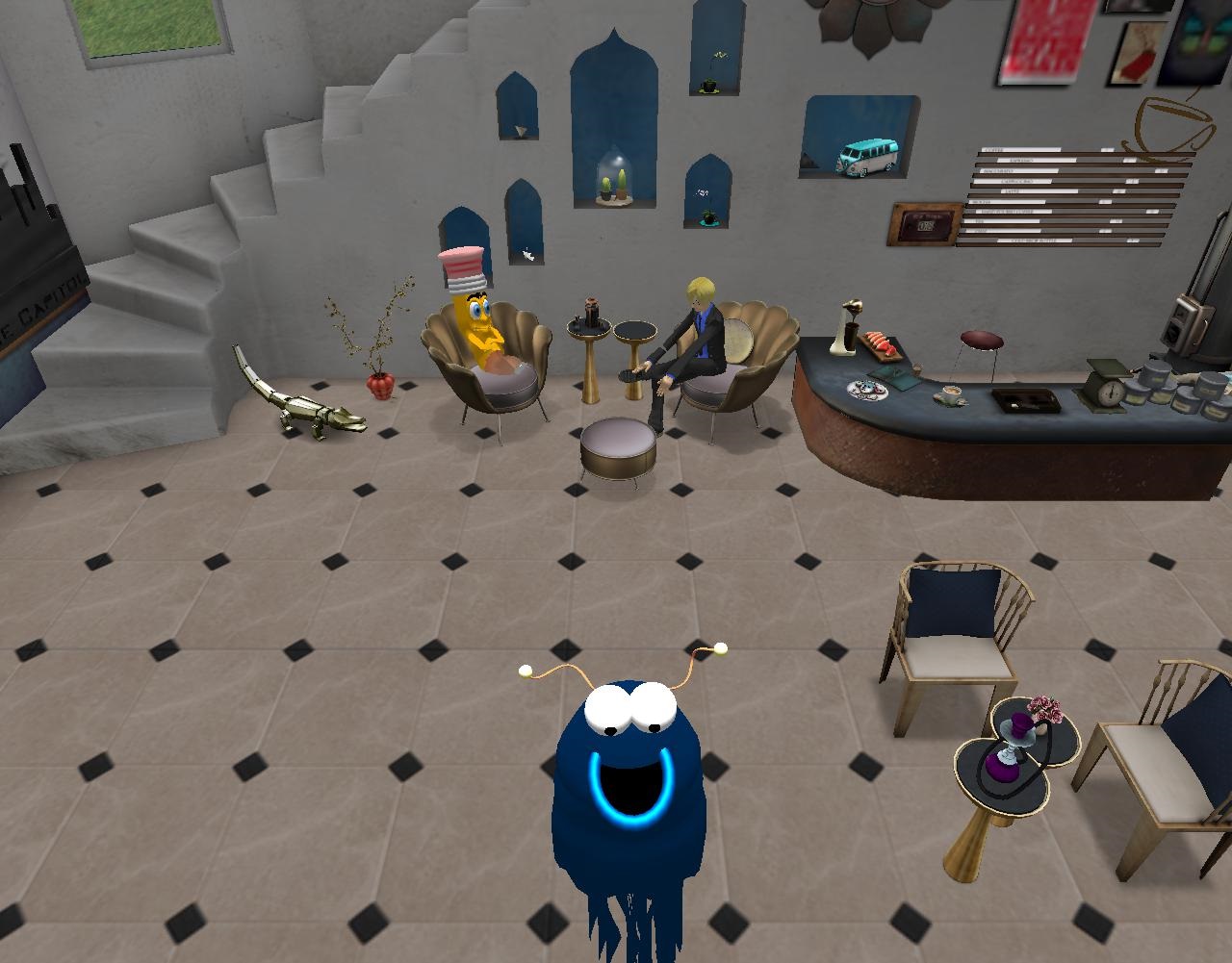 “You’re welcome!” gruffed the large, blue creature while shuffling his way out of the same colored coffee shop.