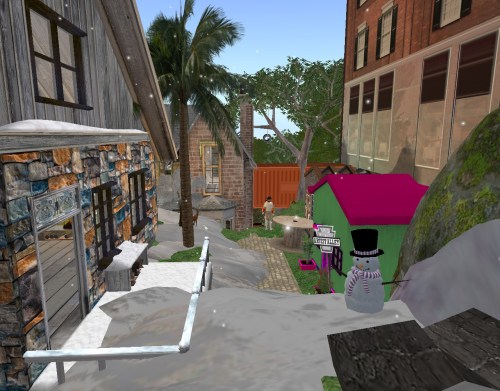 This is a shot of downtown Notherton, a former Mossman hot bed of action and adventure. Now deserted, supposedly. Main Mossman (Mossmain?) Gene Fade has stated he use to work in its metropolitan area in a 5 sided mall managing a cappery.* I believe his store sold the equivalent of our baseball caps, or at least that was the most popular item. He mentioned a game like baseball, but with extra bases and some other different stuff. Have to look all that up from the Baker Blinker Blog again; the game of Whack-Bat from Fantastic Mr. Fox comes to mind. So much to comb through in these blogs now (!).