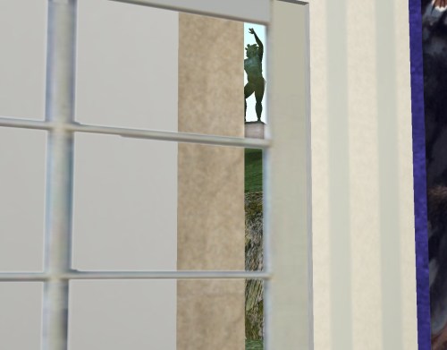 “I’m trying. You got those freebies at the furniture place just across Route 14 in front of us. Very handy.” He peers toward the far window. “And if you look at just the right angle over there you can see the giant faun statue. Reassuring, I suppose…”