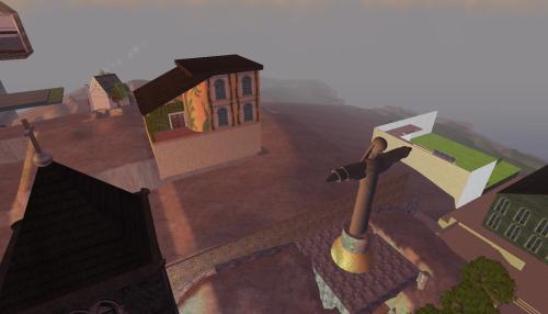 duplicate house above the giant Jesus statue, formerly in Siliconicus; note that Jesus faces *away* from the house here, and the faun faces toward the identical one in Fumb — seems to reach for it, even