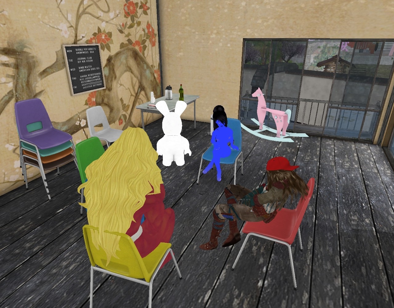 He turns around. “Very good, all. Honestly, I thought that Gill here may be confused about the red and blue chairs, since he is both red and blue. But his *hair* is yellow, and he has correctly deduced, or you gals have helped him deduce, that that is his defining color, since it covers *both* hemispheres. And Blue Berry Girl, that naturally leaves you with the blue chair, and, likewise, you (he points to the east chair), Lu Ellen, with the red. Thank you all.”