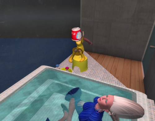 “It’s *glorious* in here, Col. Bucket.” She splashes some water in happiness. “Come on in!”