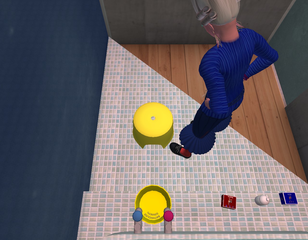 “I — can’t get — this *bucket* off,” the smaller person in the 90 room complains, yanking with all her might.