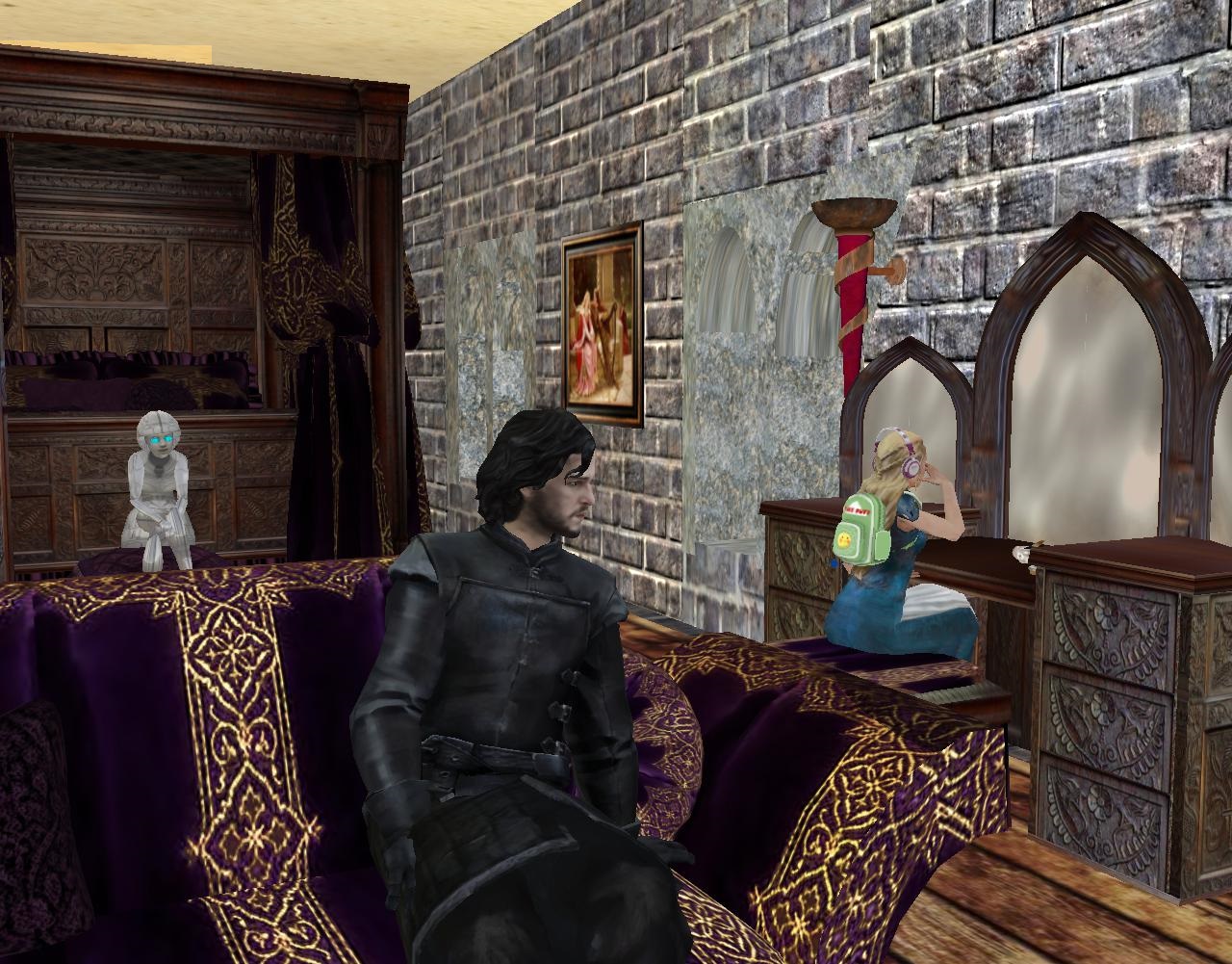 Little Katy Kidd watches from the Northeast Tower of the Southwest Castle at her future self seeing off her future husband Jack Snow (played by actor Jack Toadswallow in seasons one through three) one last time at the docks of the Northeast *Castle*. This would be his last war, his ship sunk at sea by a giant piece of cheddar broken off from the Arctic Cheese Shelf on the way over to the Heterocera continent. How sadly, sadly ironic given the instigation for the conflict. Little Angus Girl, then just plain ol’ Lucy Saffold, accompanied her to the past-future viewing, but ended up staring more southwest than northeast from the Southwest Castle’s Northeast Tower, toward the now deserted Splinterwood Castle just over the border from this here Hilling sim. She even pens a song on the spot about the eventful moment(s), later expanded into Redeye’s first full blown concept side of an album called “Confusing Directions,” derided by early critics for its seeming lack of focus, before the full genius of Redeye’s leader was understood by the confused masses.