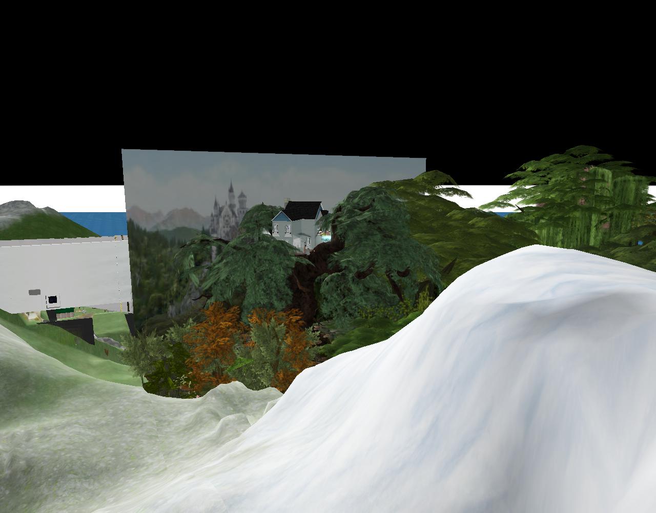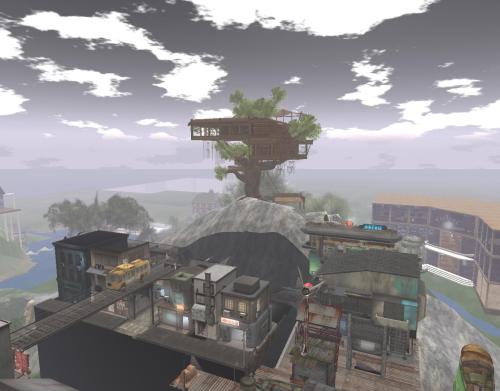 Contrary to popular opinion, there were places of sanctuary within the Omega continent. This treehouse for instance, although it is minimally so. Owned by Lisa the Vegetarian as it turned out; the “city” in front of it as well, which she declares in the land description she is, “just mucking about with like a lemonade stand”, with little in internal living space yet. In fact, she owns the mountain just north as well (the “city” spanning both), renting half to a company she doesn’t directly associate with but understands the reason for. Our Second Lyfe is split, a bigger half over here and a smaller half way over there. It’s like you have a basket of apples on one side and an orange or two on the other. How to sew them together? Well… you can’t. They remain…